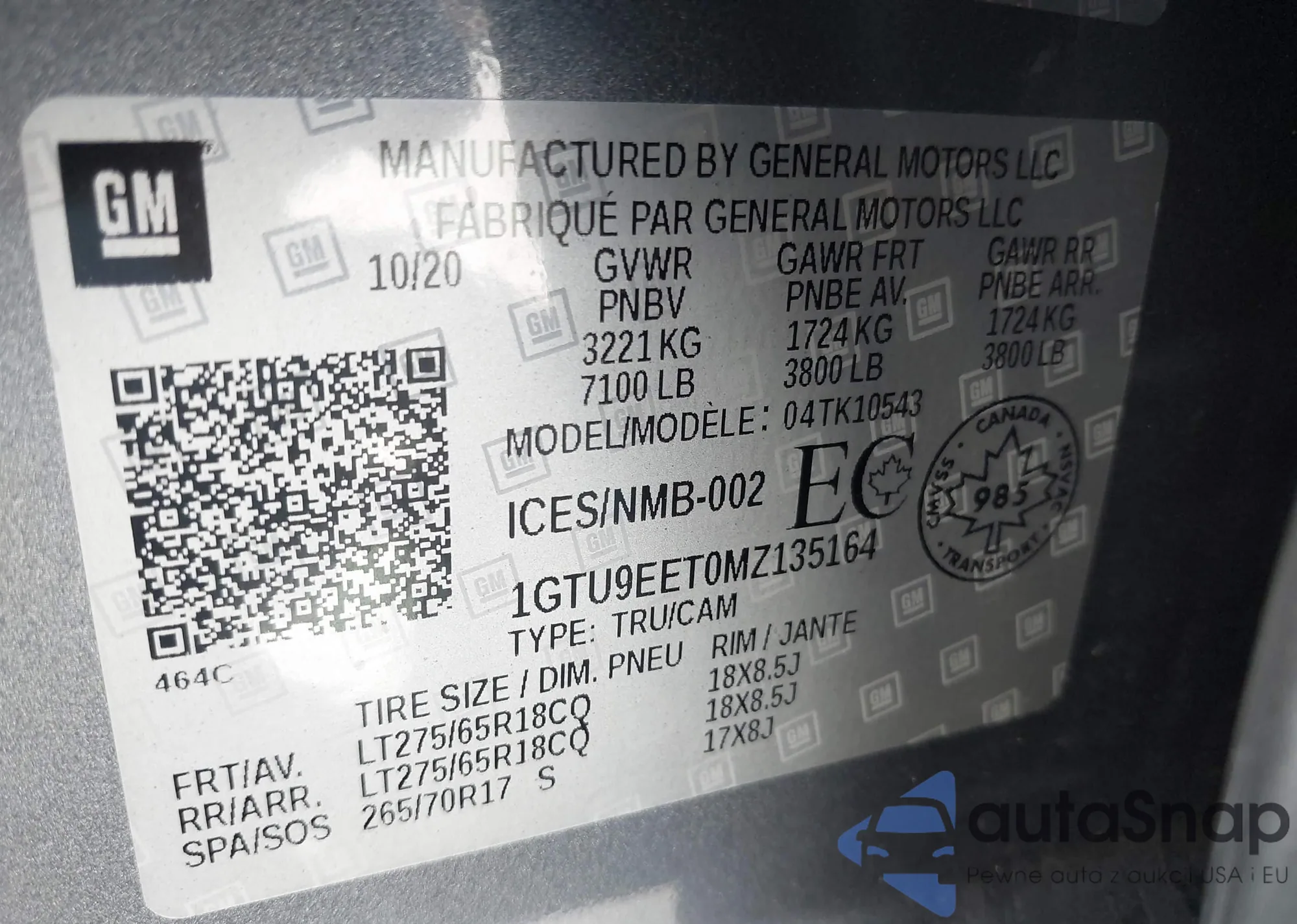 • VIN 1GTU9EET0MZ135164