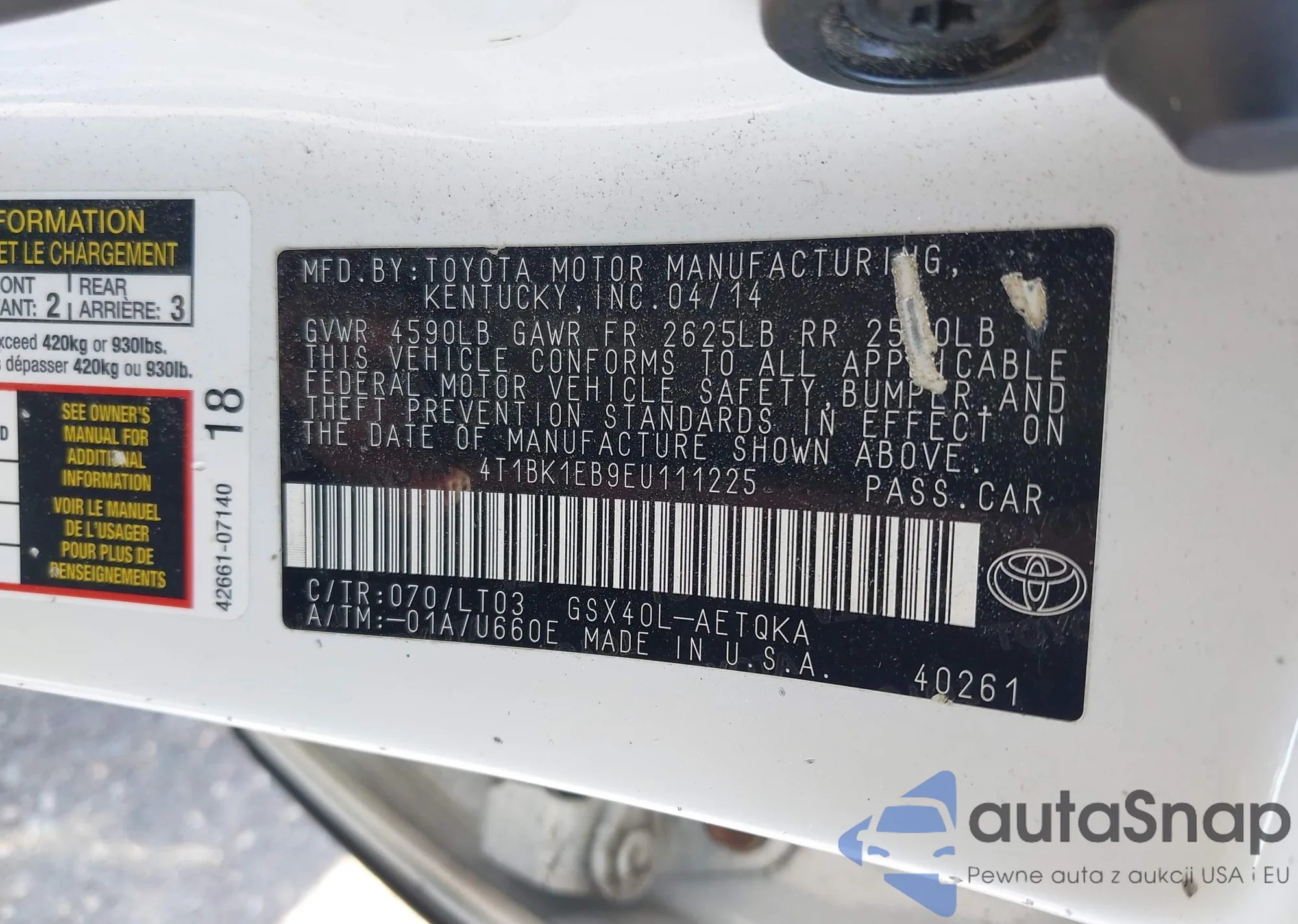 LOT: 42561314 VIN: 4T1BK1EB9EU111225