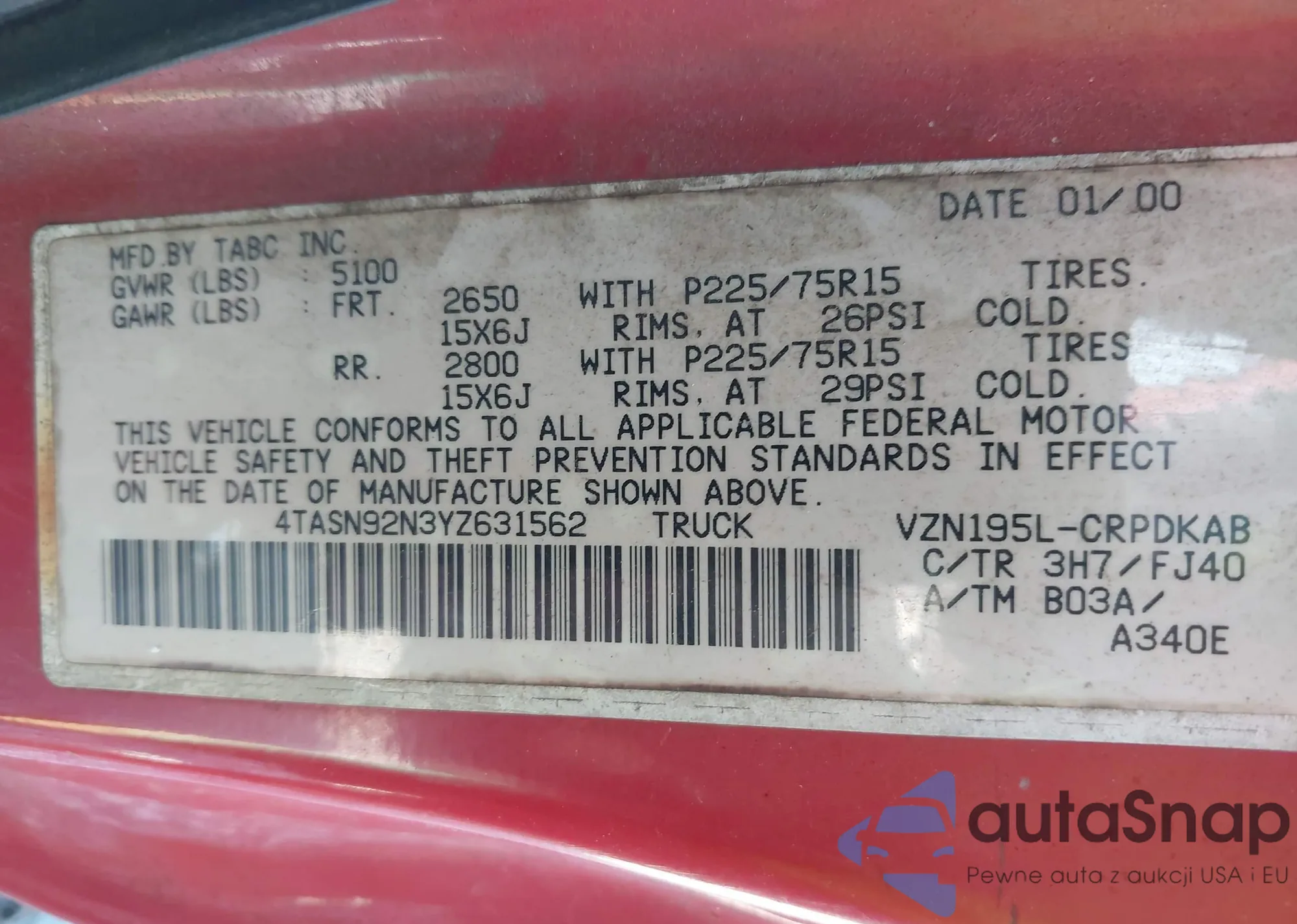 • VIN 4TASN92N3YZ631562