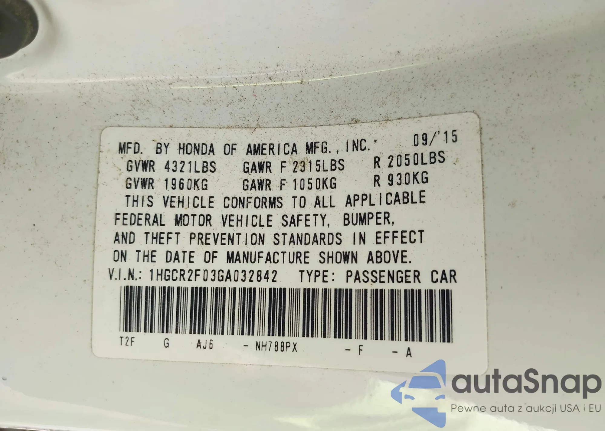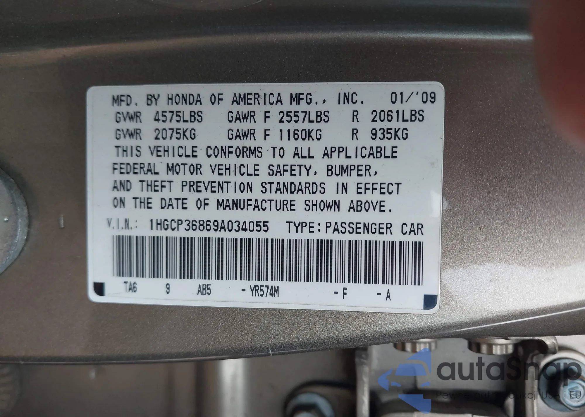 LOT: 42710720 VIN: 1HGCP36869A034055
