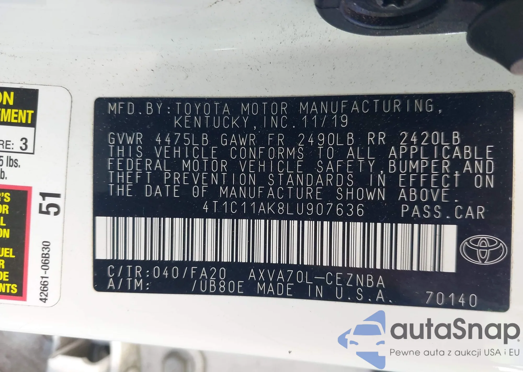 LOT: 42541282 VIN: 4T1C11AK8LU907636