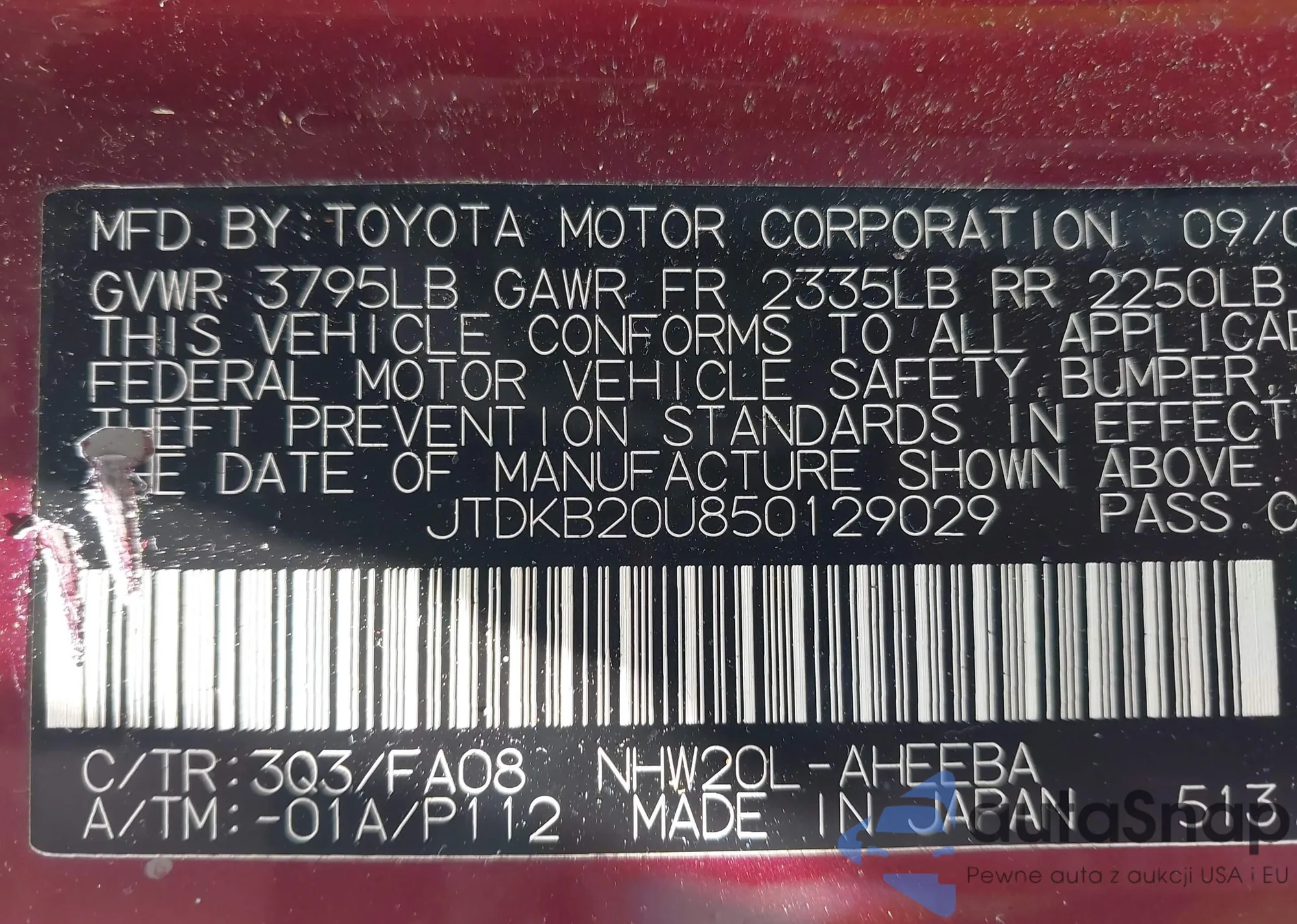 LOT: 42560343 VIN: JTDKN3DU6D0338694