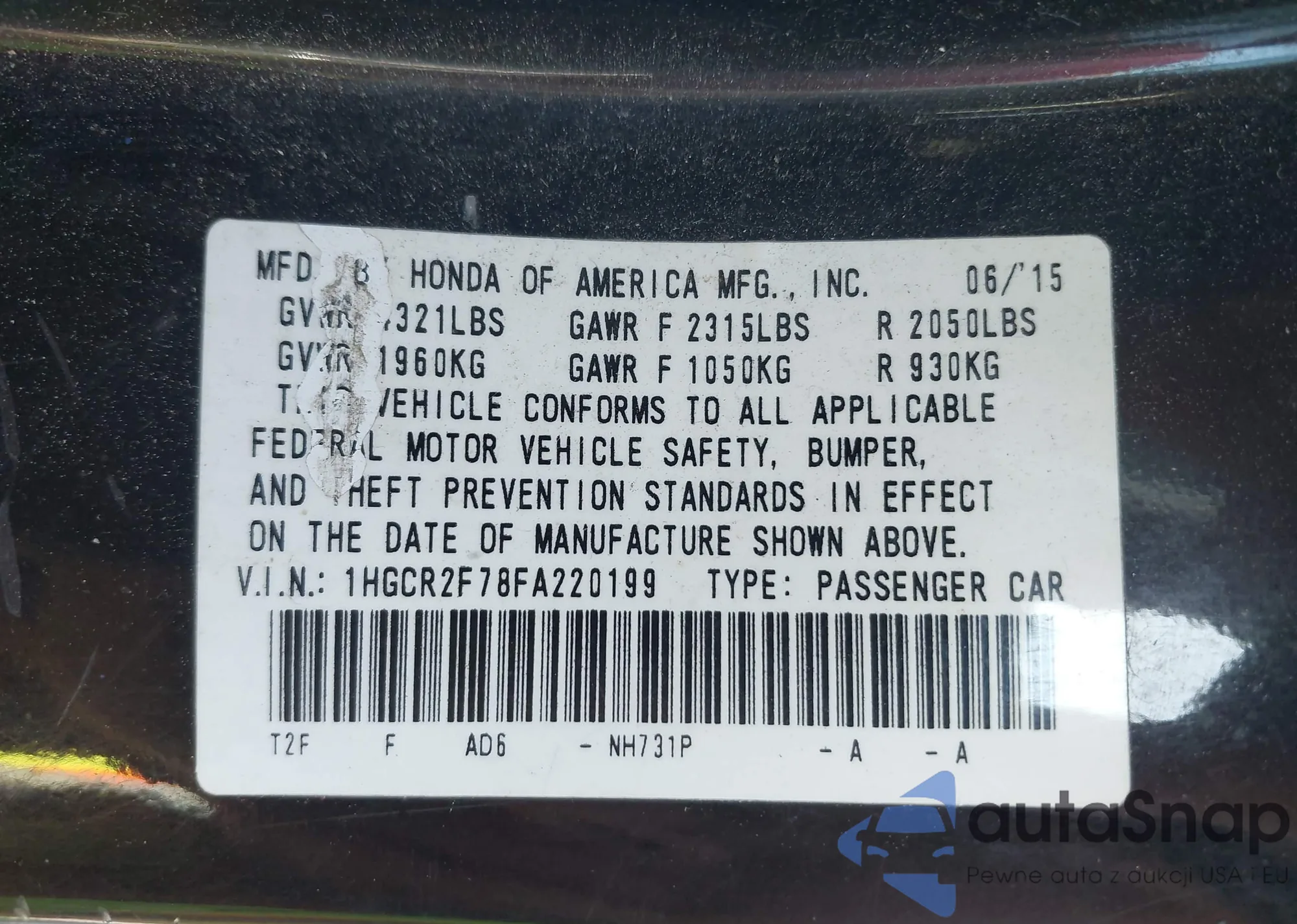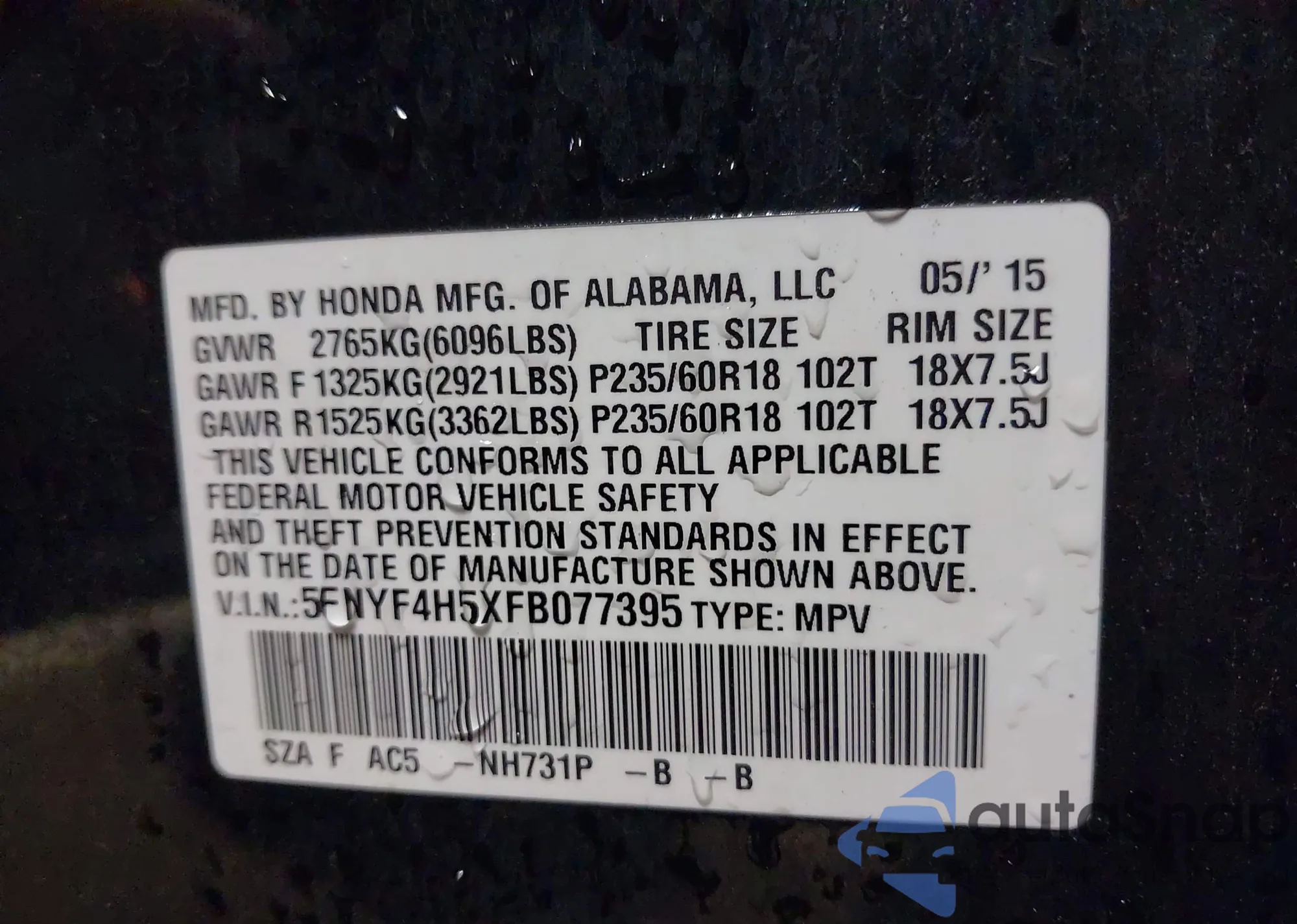 LOT: 42364422 VIN: 5FNYF4H5XFB077395