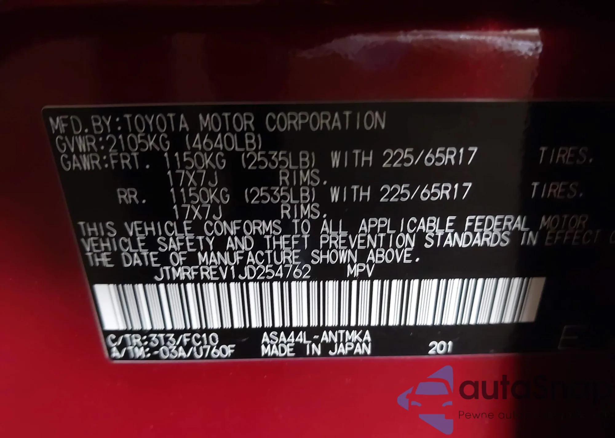 • VIN JTMRFREV1JD254762