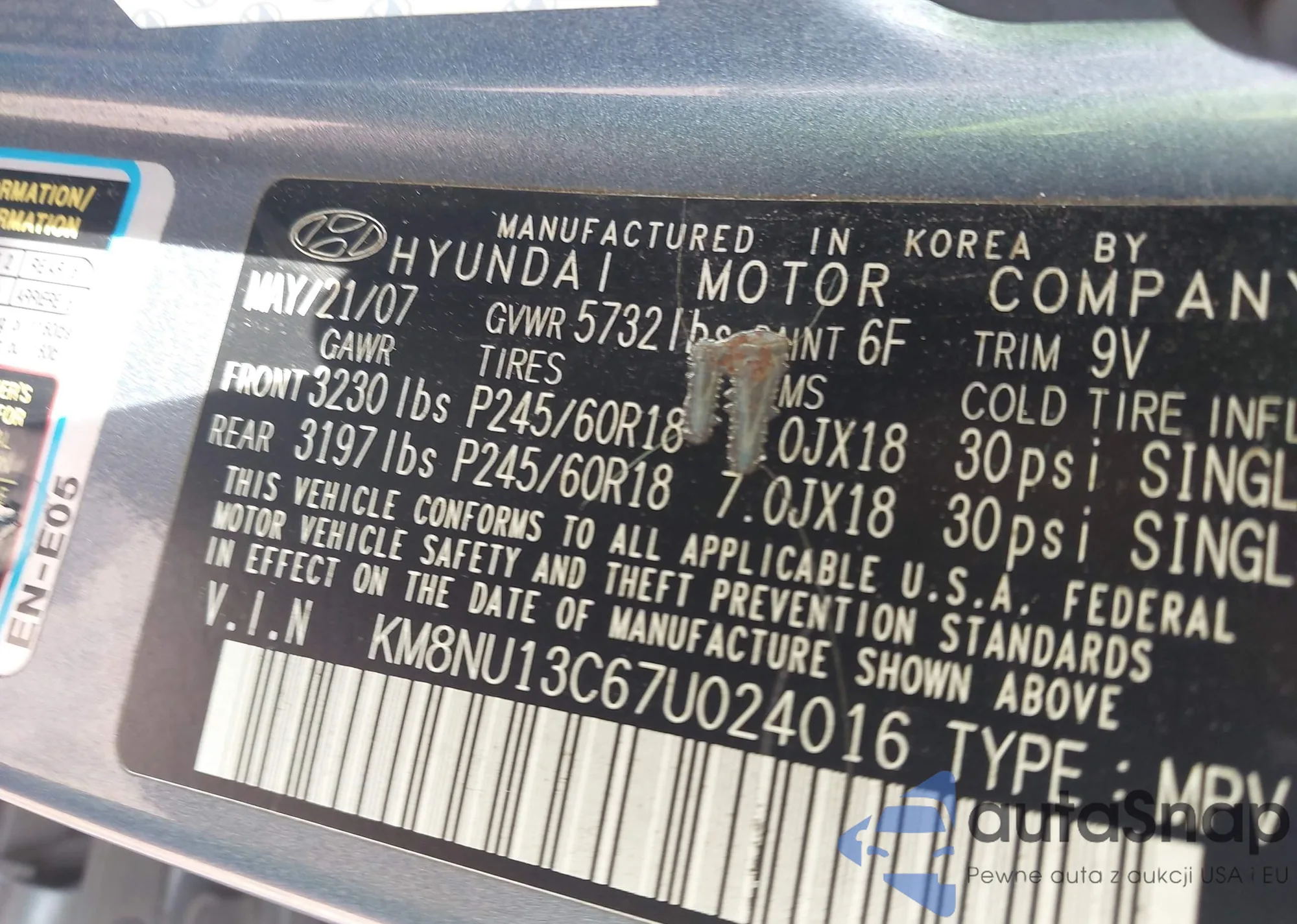 LOT: 42491374 VIN: KM8NU13C67U024016