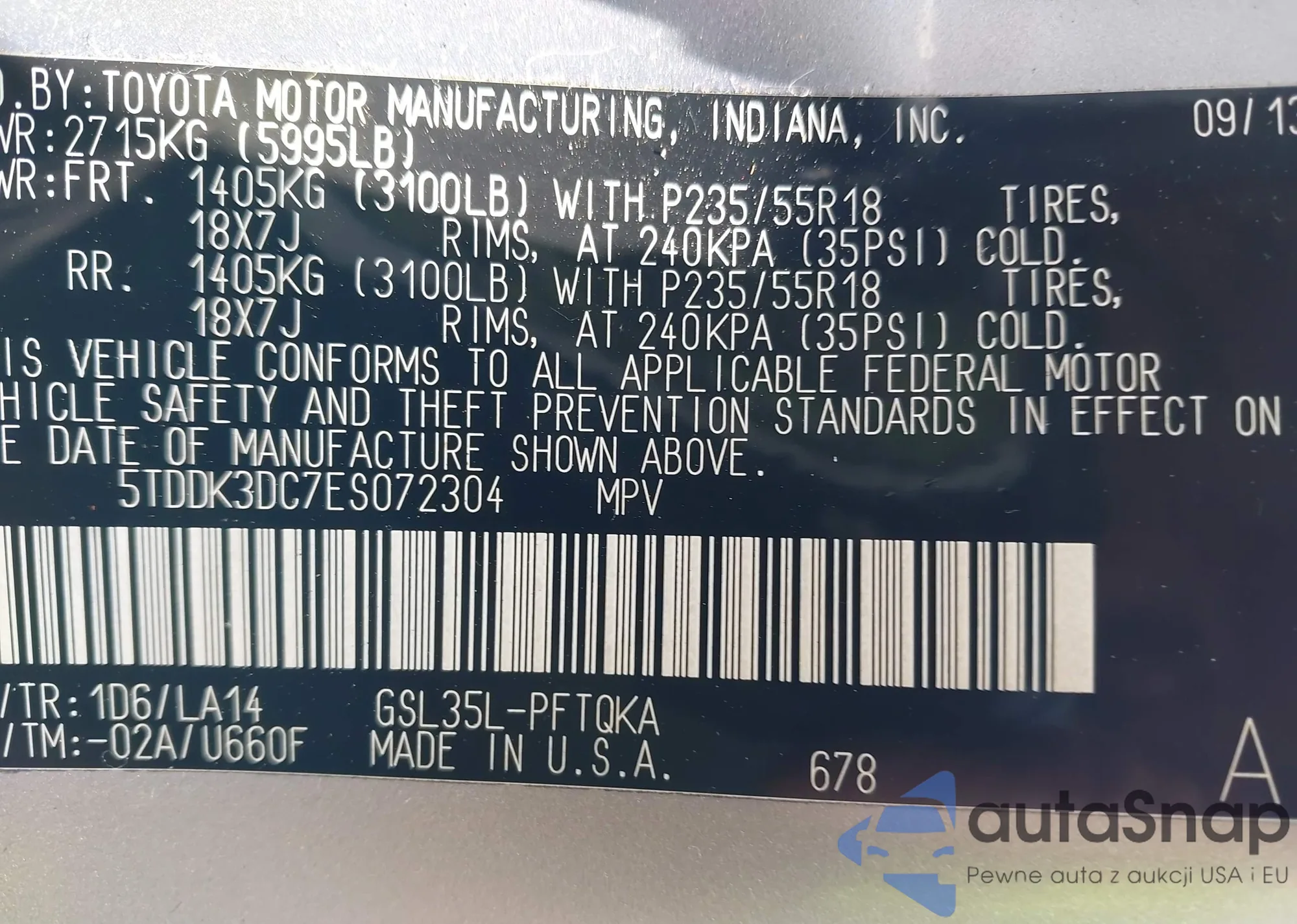 LOT: 42694195 VIN: 5TDDK3DC7ES072304