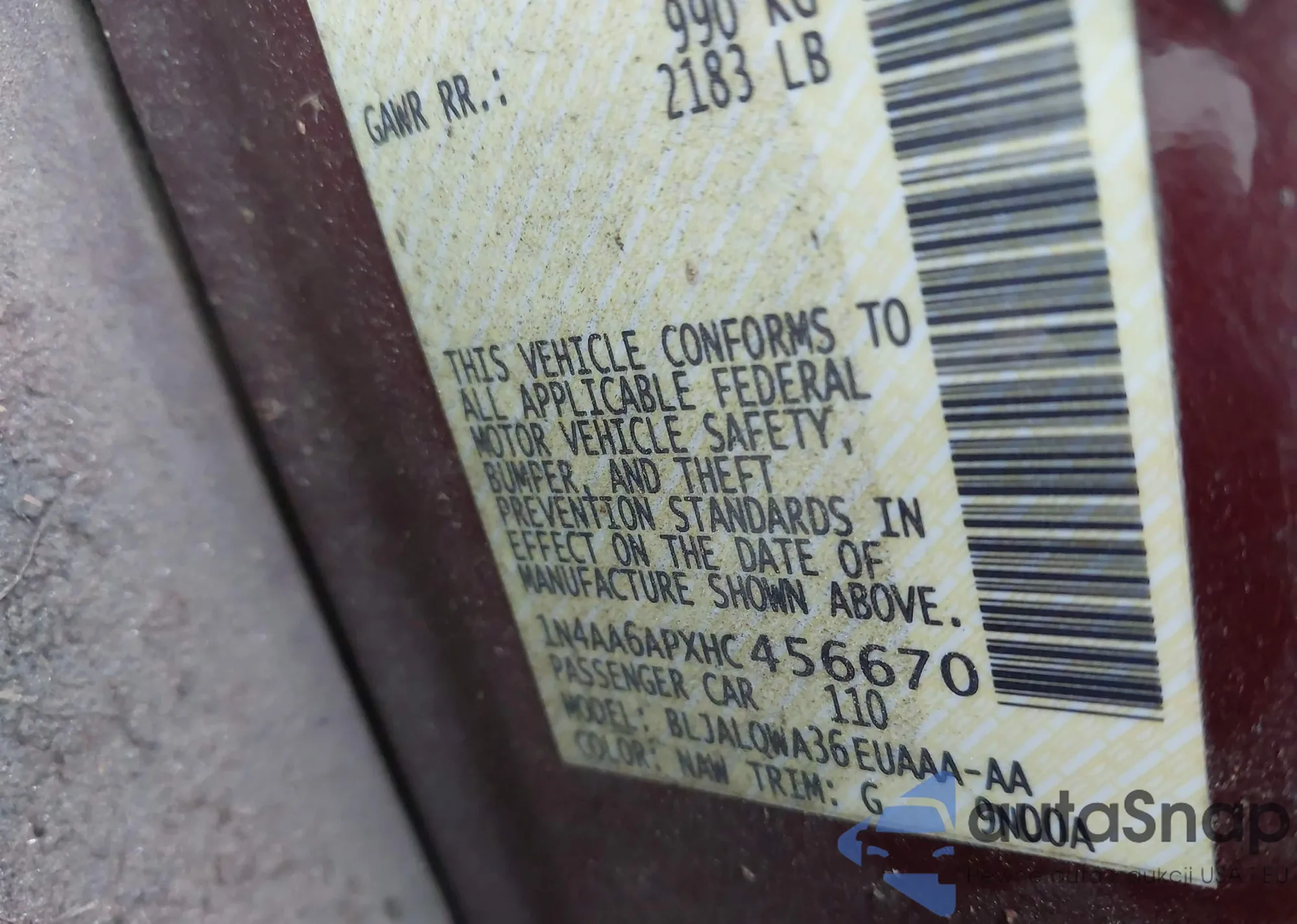 • VIN 1N4AA6APXHC456670