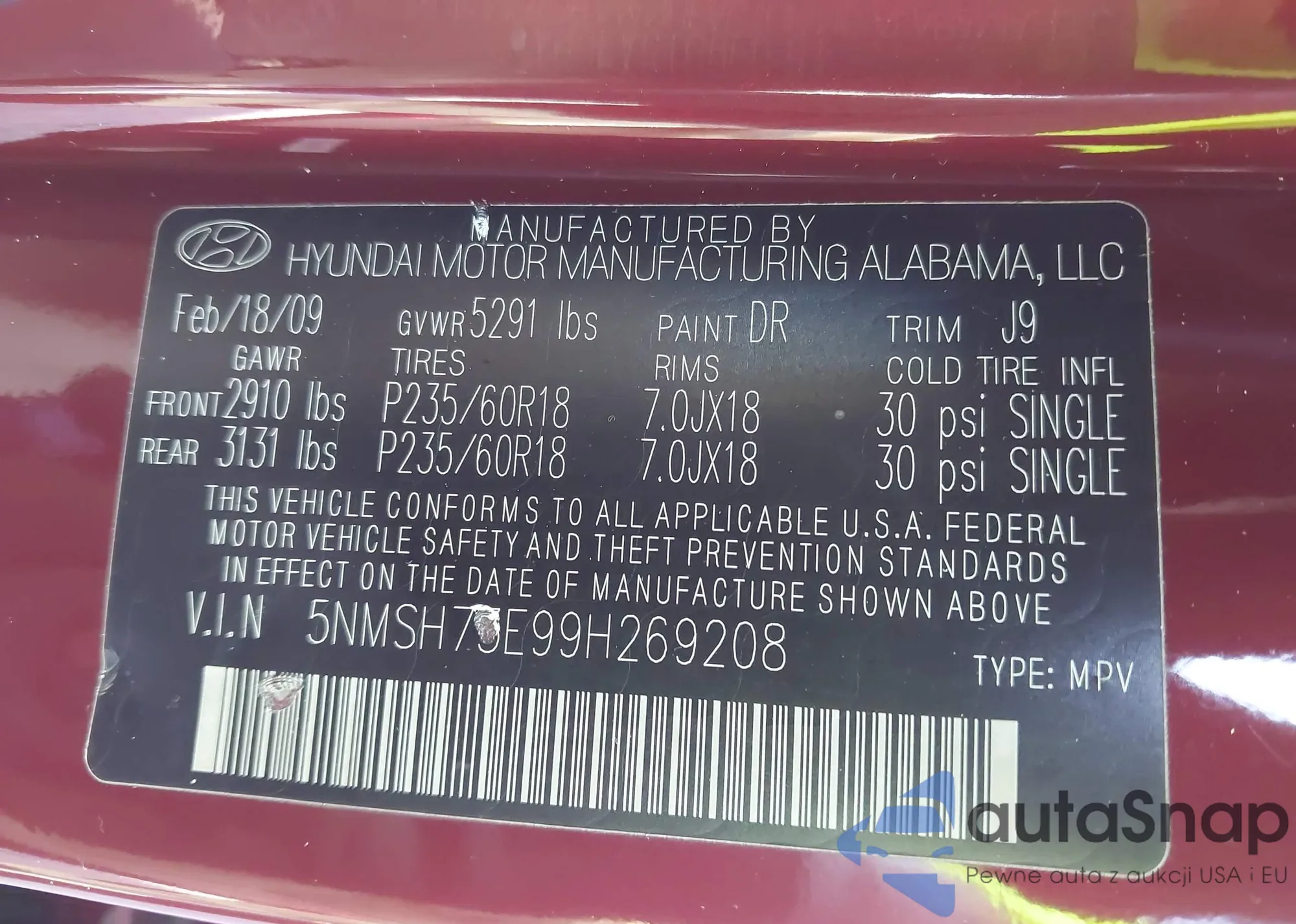 LOT: 42792293 VIN: 5NMSH73E99H269208