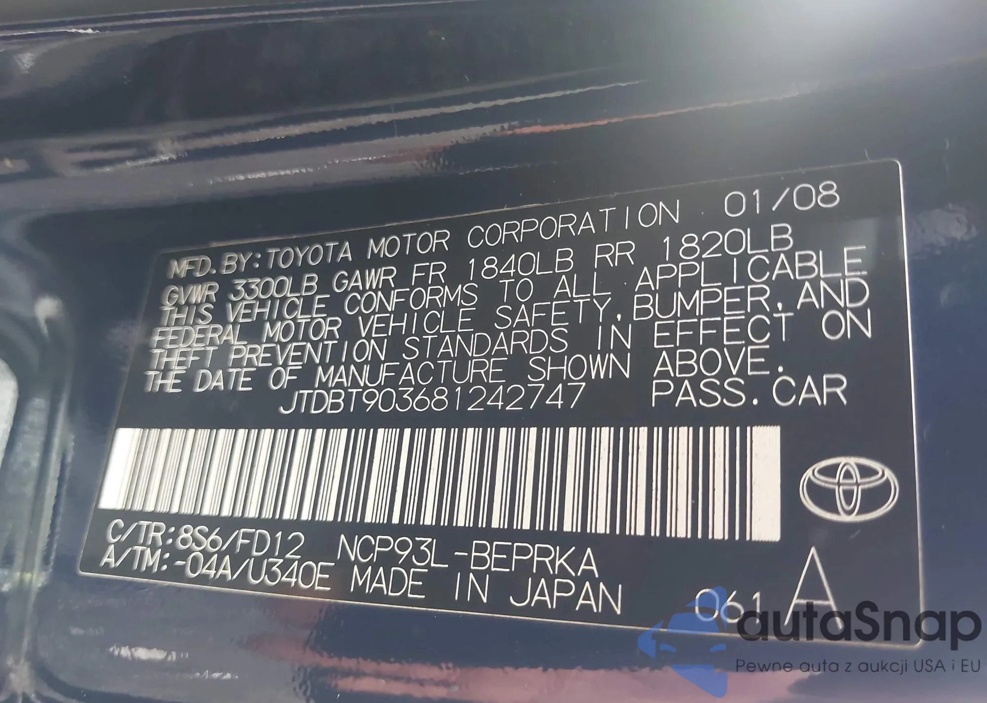 LOT: 42731295 VIN: JTDBT903681242747