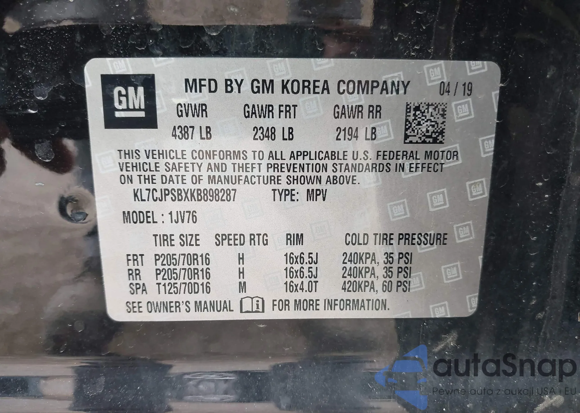 • VIN KL7CJPSBXKB898287