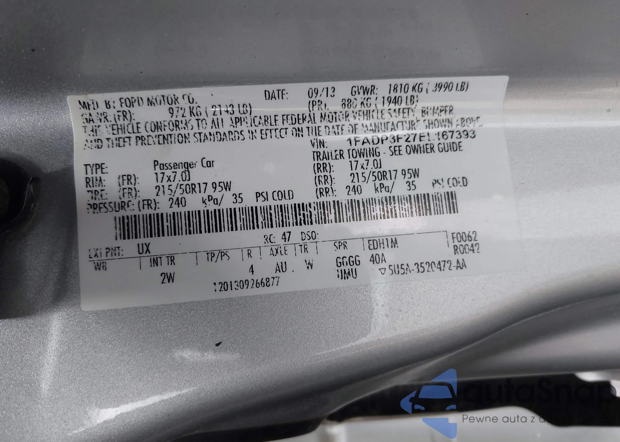 LOT: 42409328 VIN: 1FADP3F27EL167393