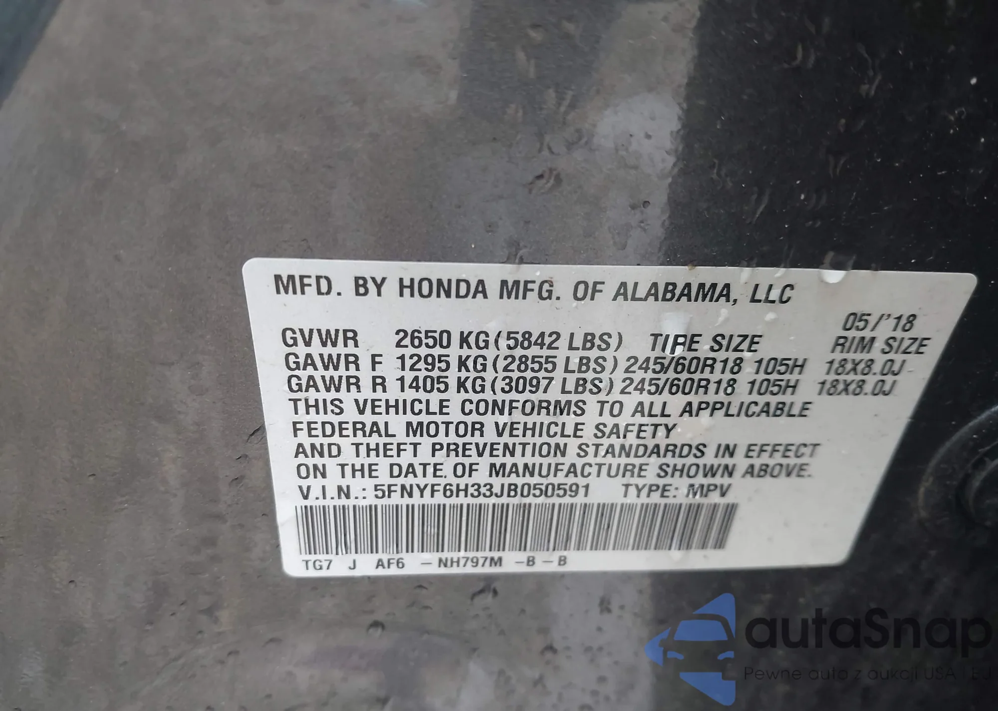 • VIN 5FNYF6H33JB050591