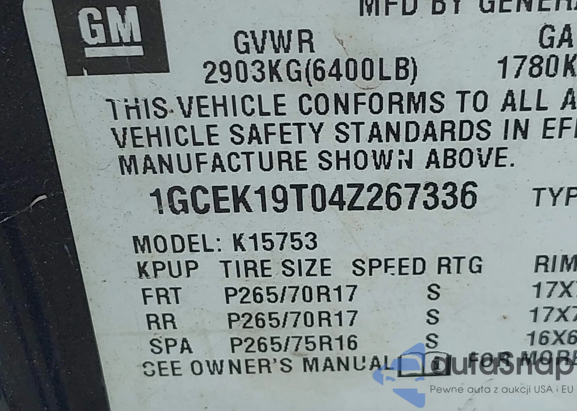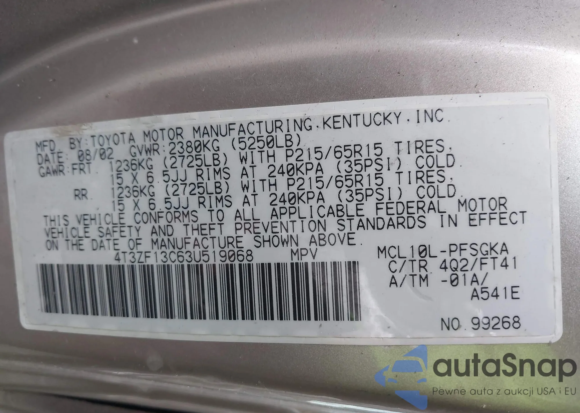 • VIN 4T3ZF13C63U519068