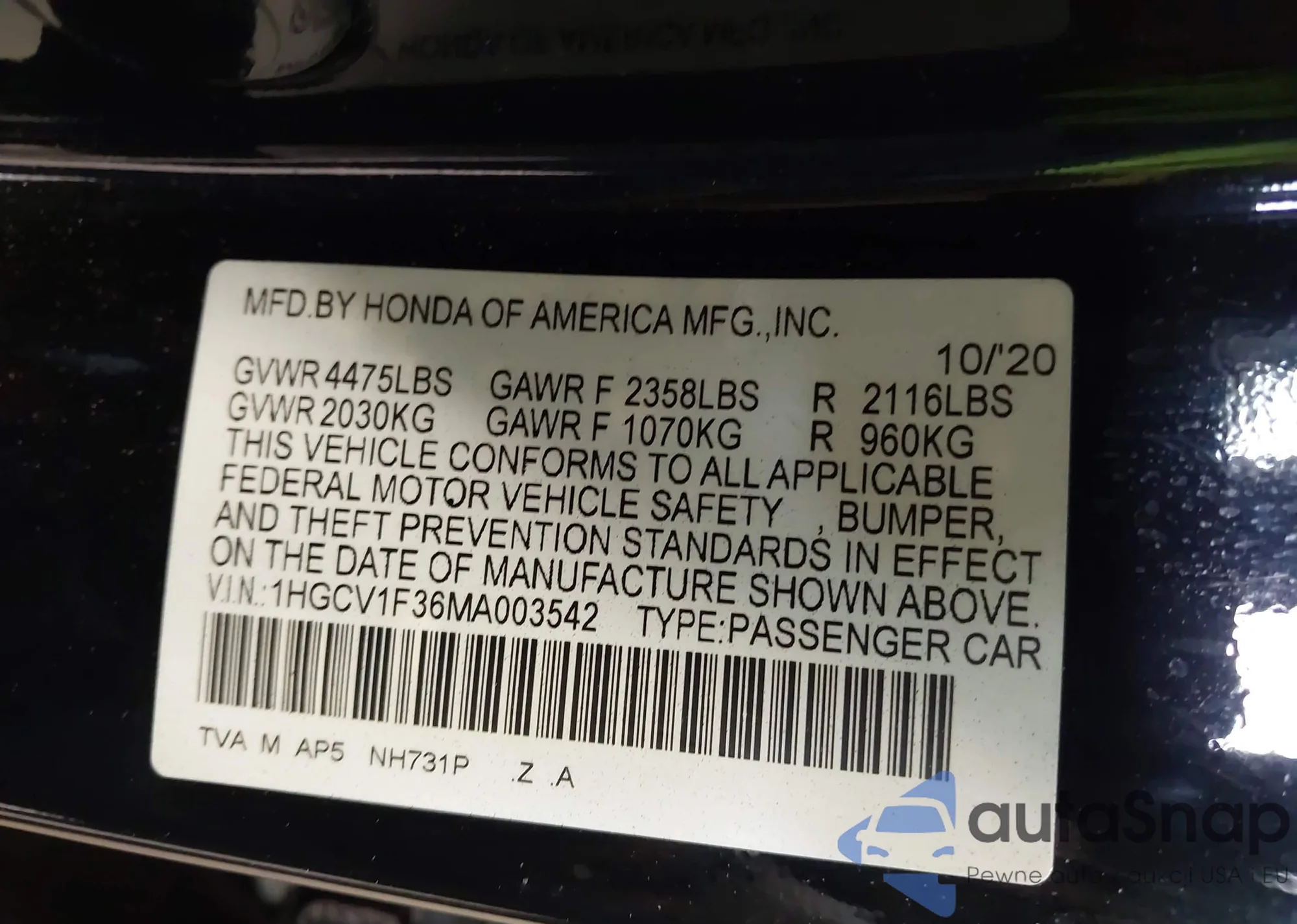 LOT: 42441422 VIN: 1HGCV1F36MA003542