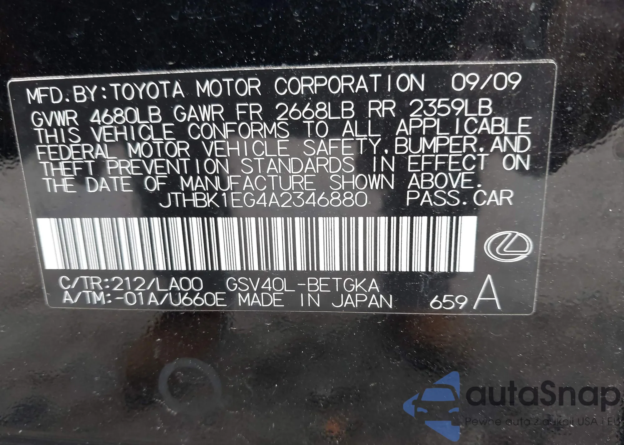 LOT: 42684224 VIN: JTHBK1EG4A2346880