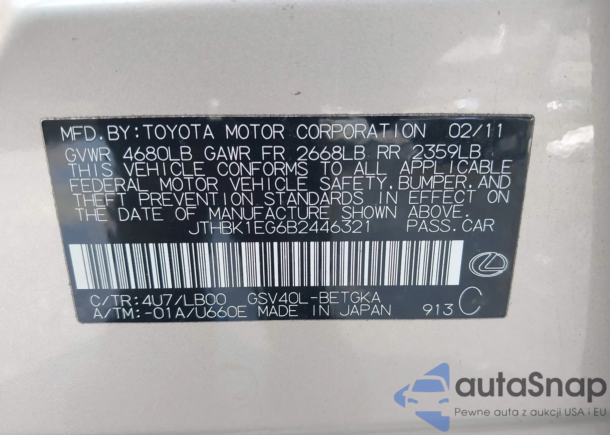LOT: 42787518 VIN: JTHBK1EG6B2446321