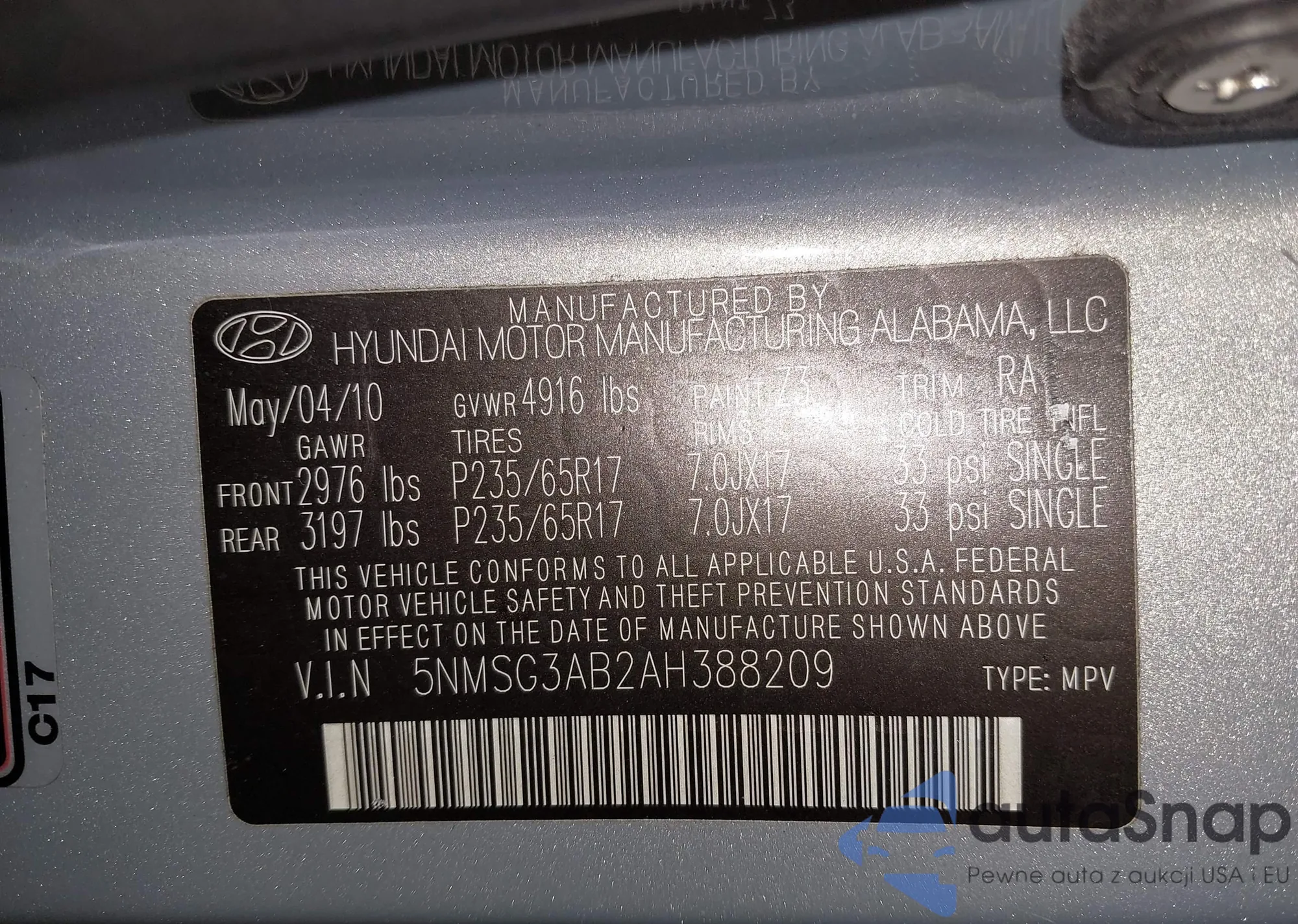 LOT: 42206561 VIN: 5NMSG3AB2AH388209