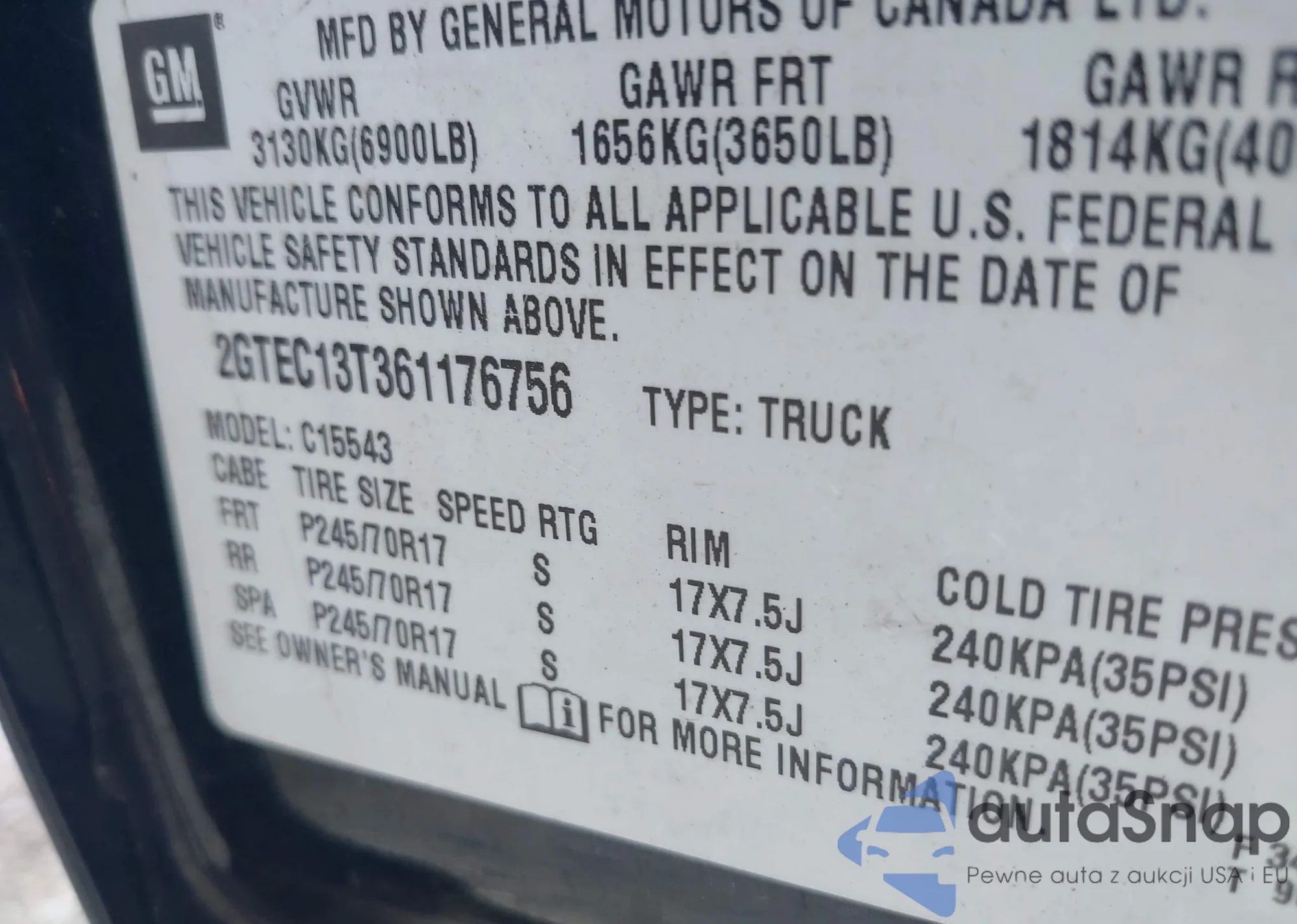 • VIN 2GTEC13T361176756