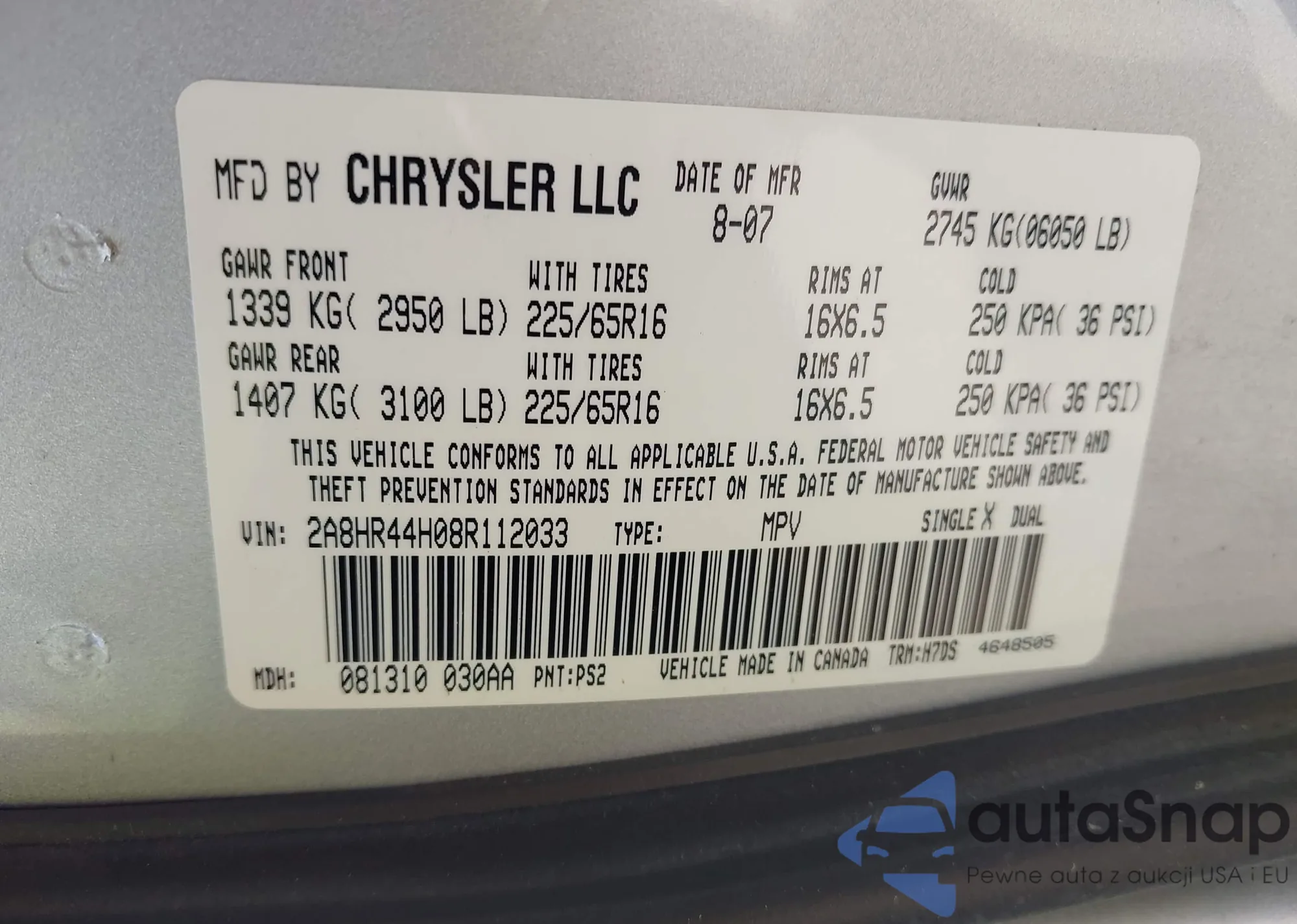 LOT: 42797659 VIN: 1HGCP36818A018585
