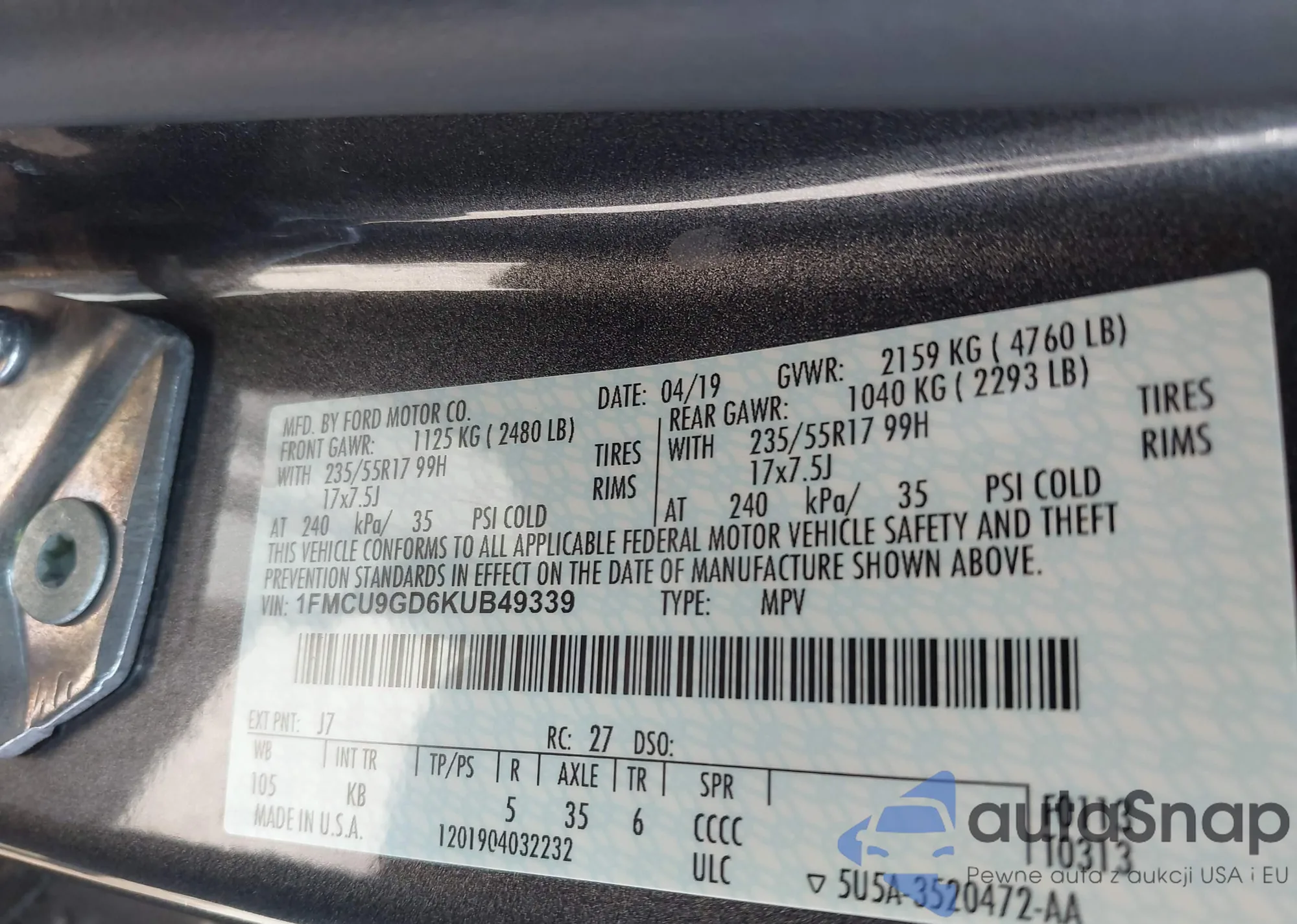 • VIN 1FMCU9GD6KUB49339