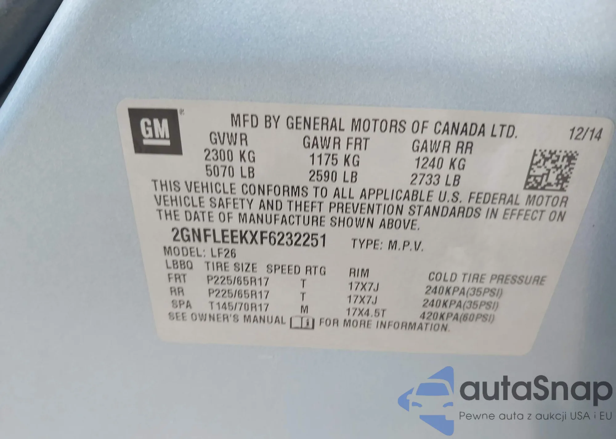 LOT: 42745158 VIN: 2GNFLEEKXF6232251