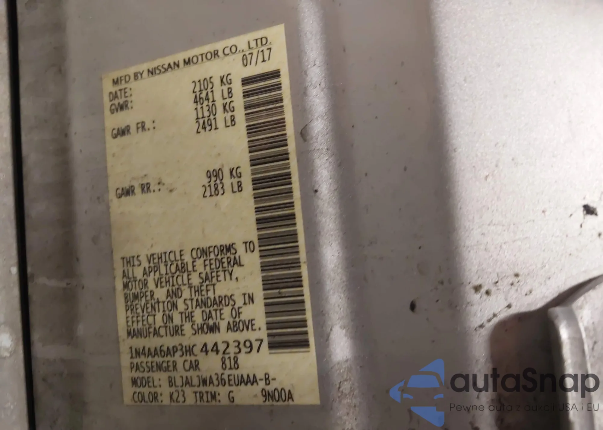 • VIN 1N4AA6AP3HC442397