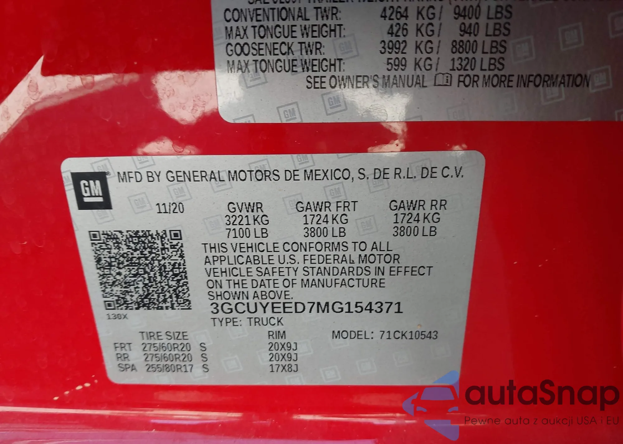 LOT: 42327197 VIN: 3GCUYEED7MG154371