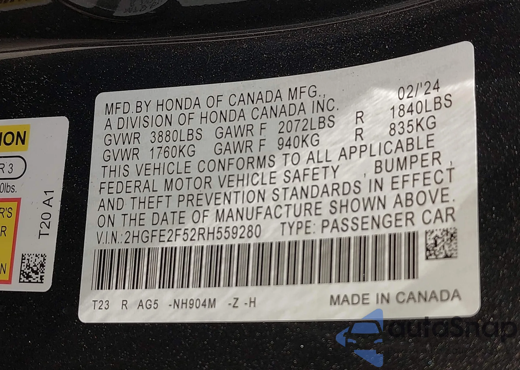 • VIN 2HGFE2F52RH559280