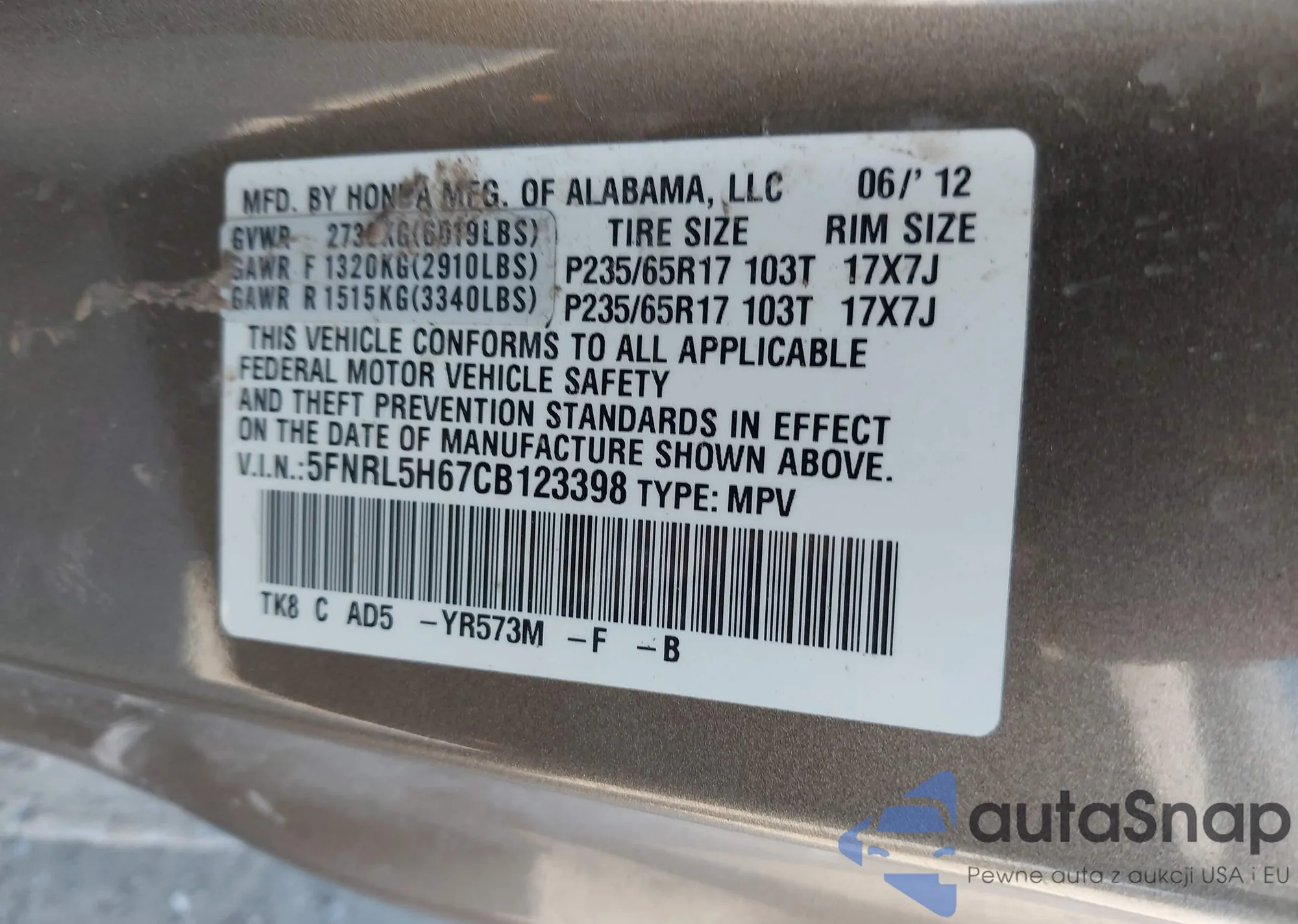 • VIN 5FNRL5H67CB123398