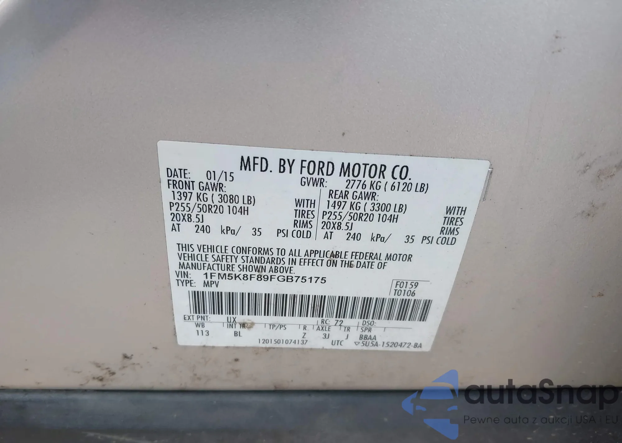 LOT: 42485939 VIN: 1FM5K8F89FGB75175