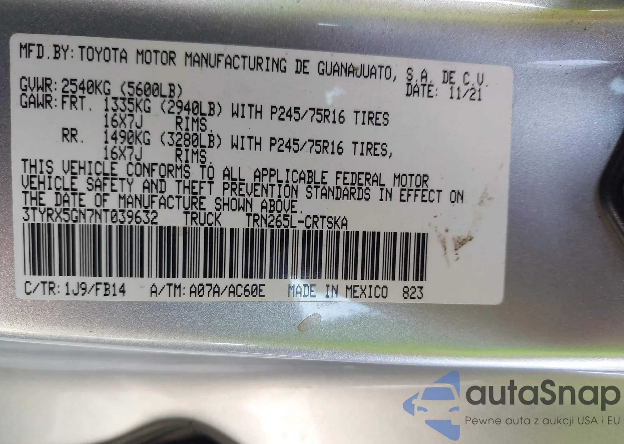 LOT: 42554729 VIN: 3TYRX5GN7NT039632