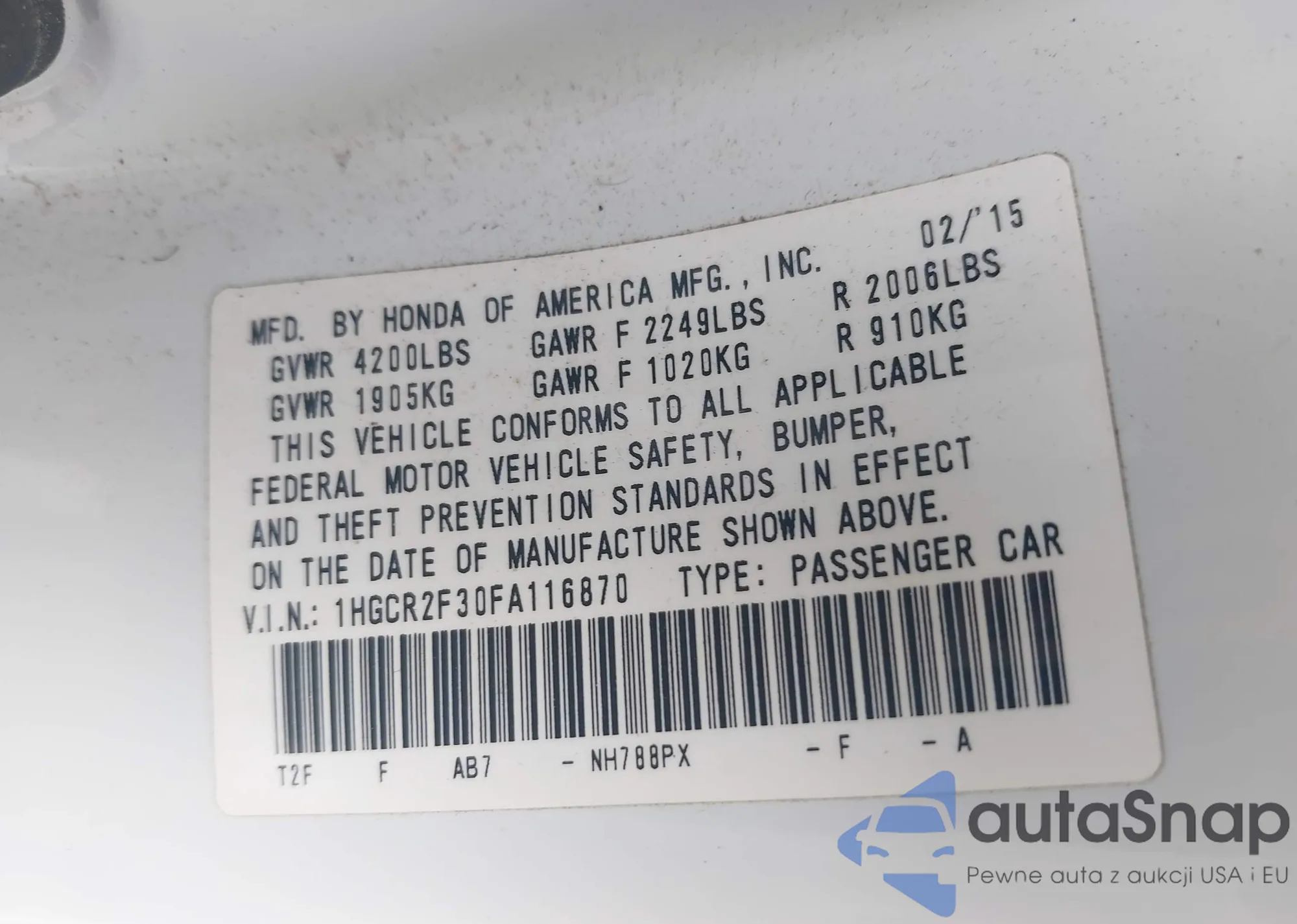 LOT: 42493115 VIN: 1HGCR2F30FA116870