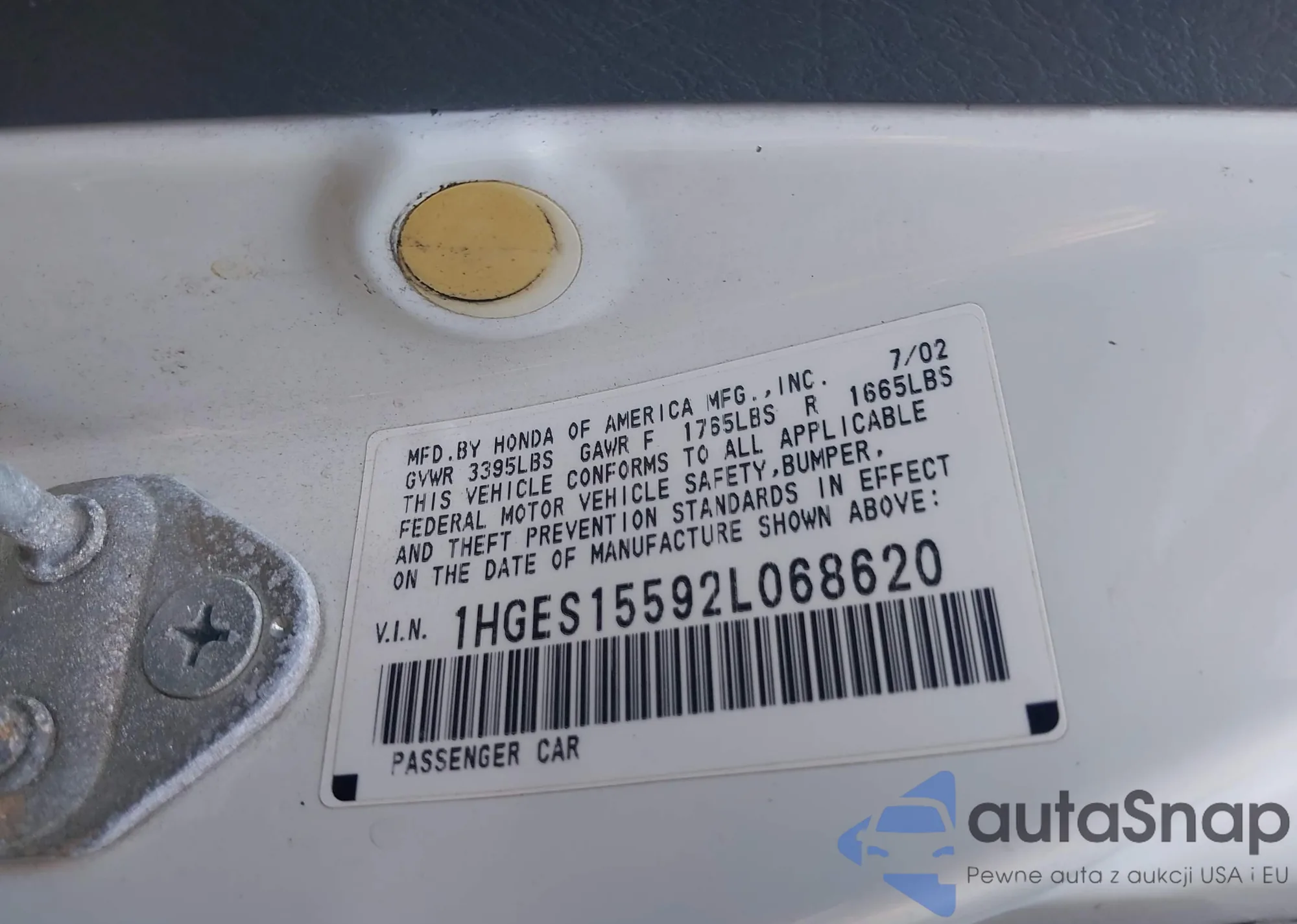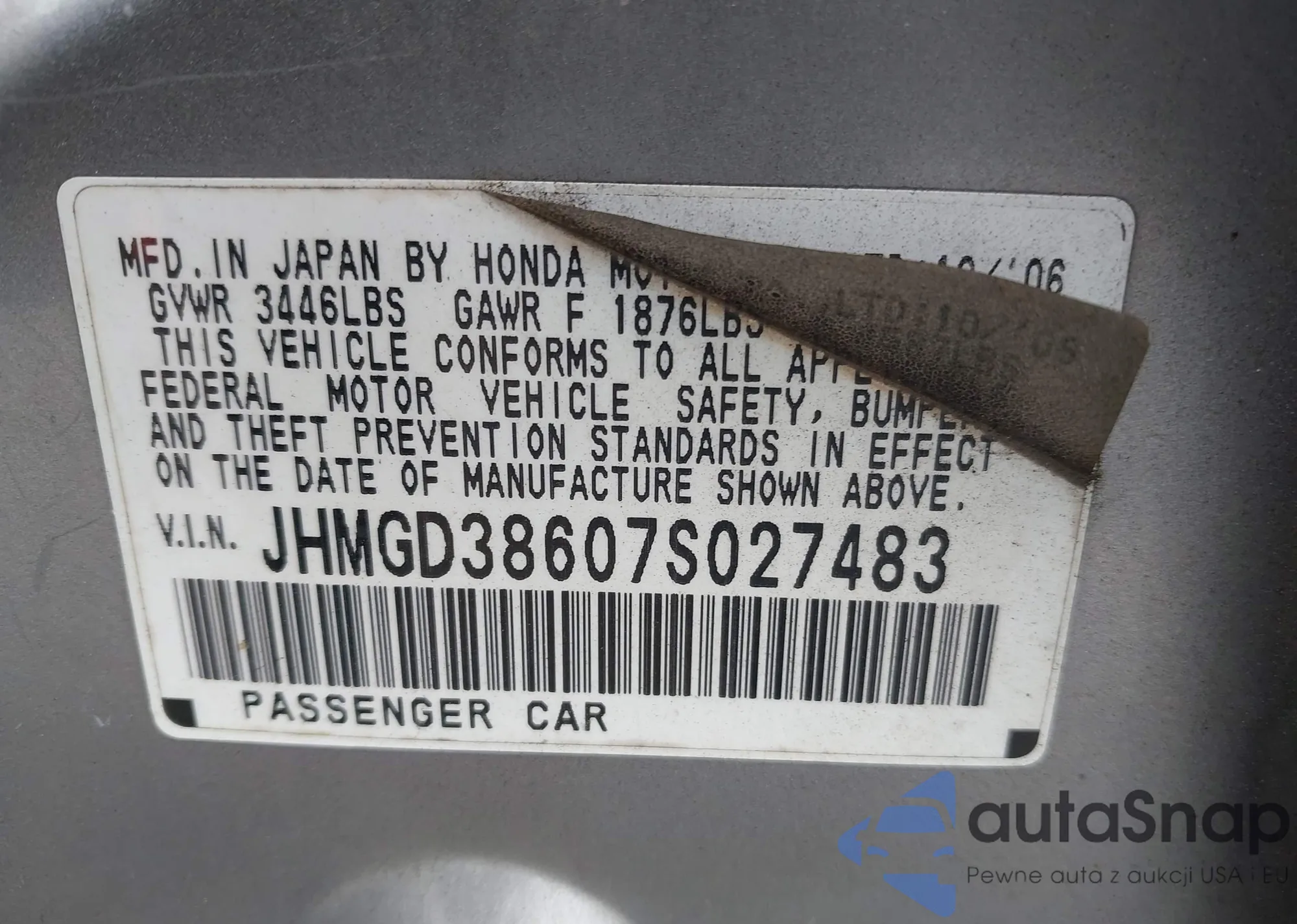 LOT: 42709482 VIN: JHMGD38607S027483