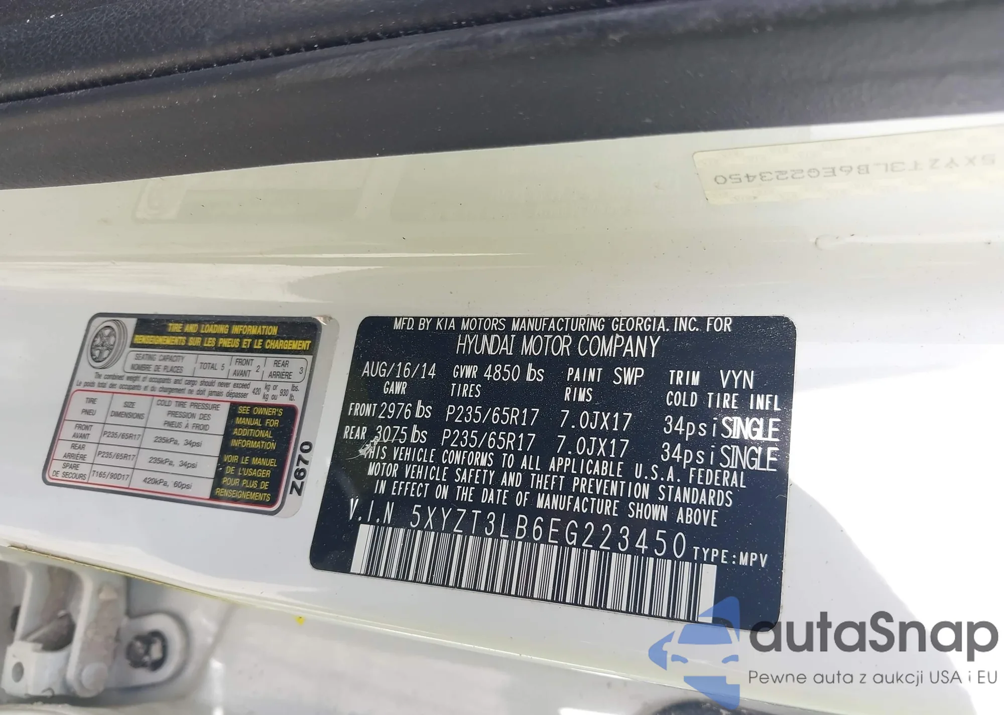 • VIN 5XYZT3LB6EG223450