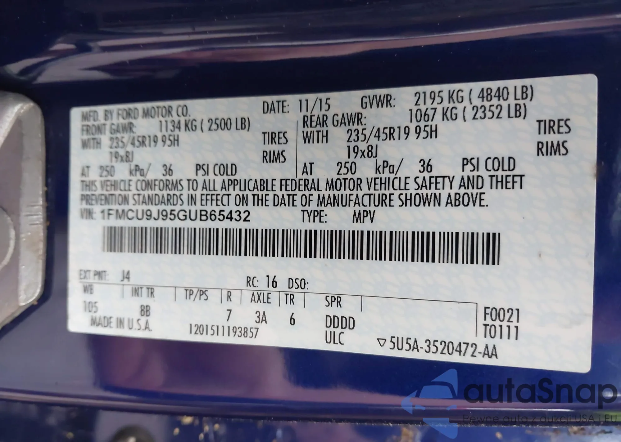 • VIN 1FMCU9J95GUB65432