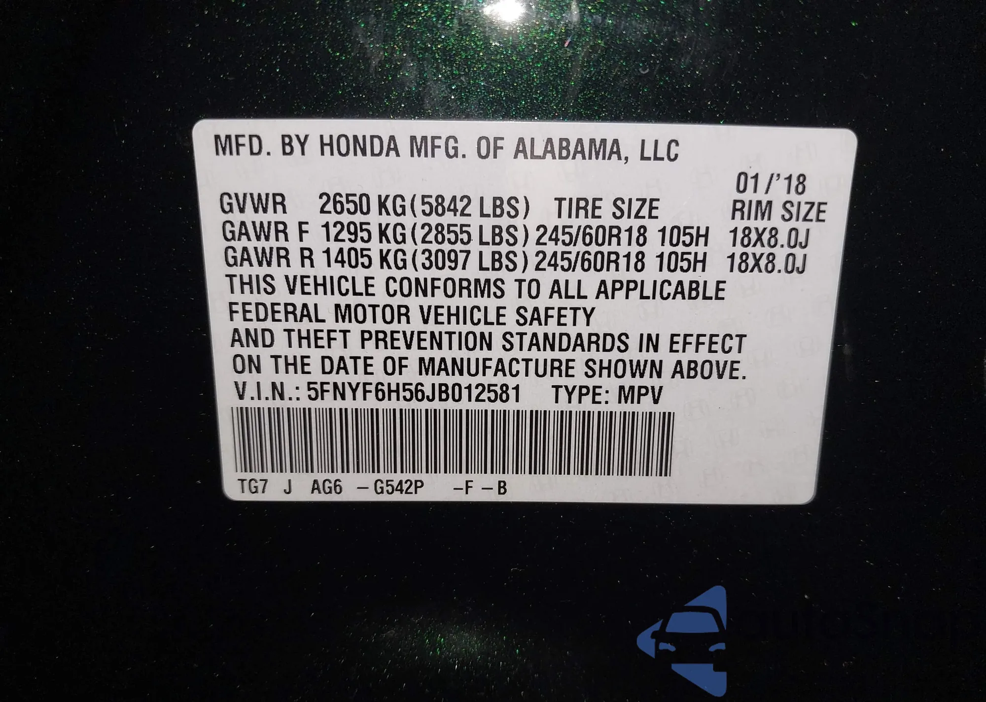 • VIN 5FNYF6H56JB012581