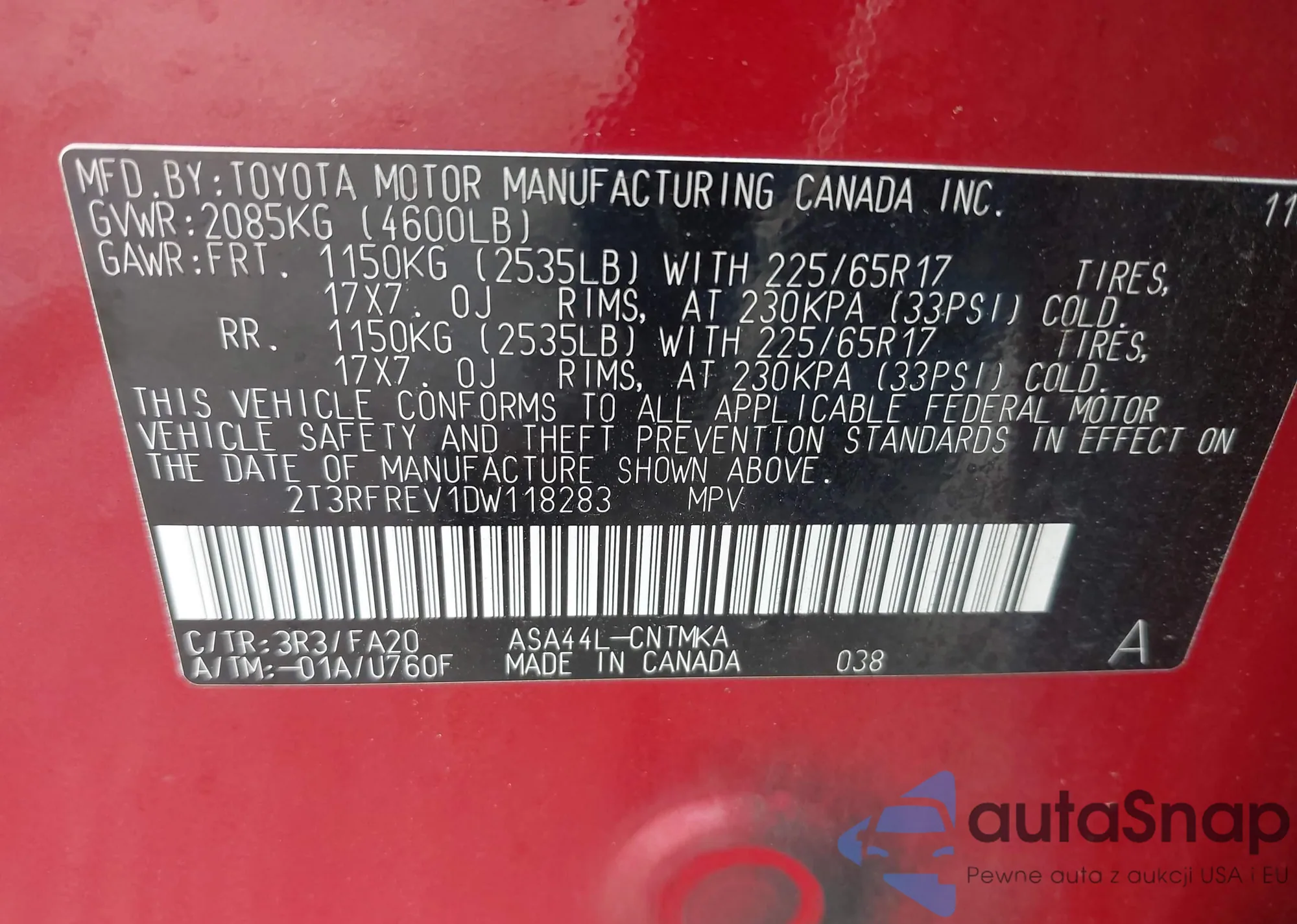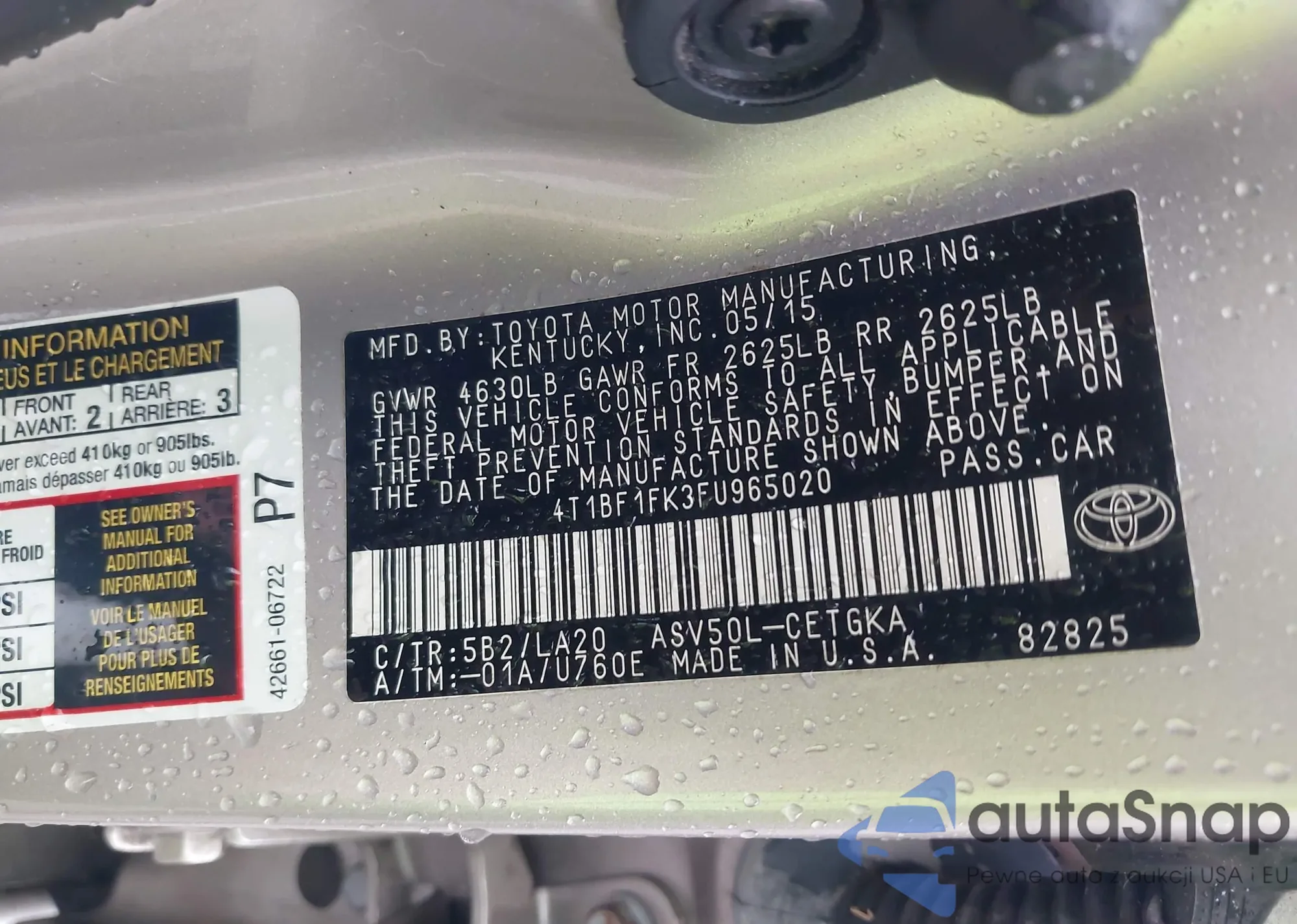 • VIN 4T1BF1FK3FU965020