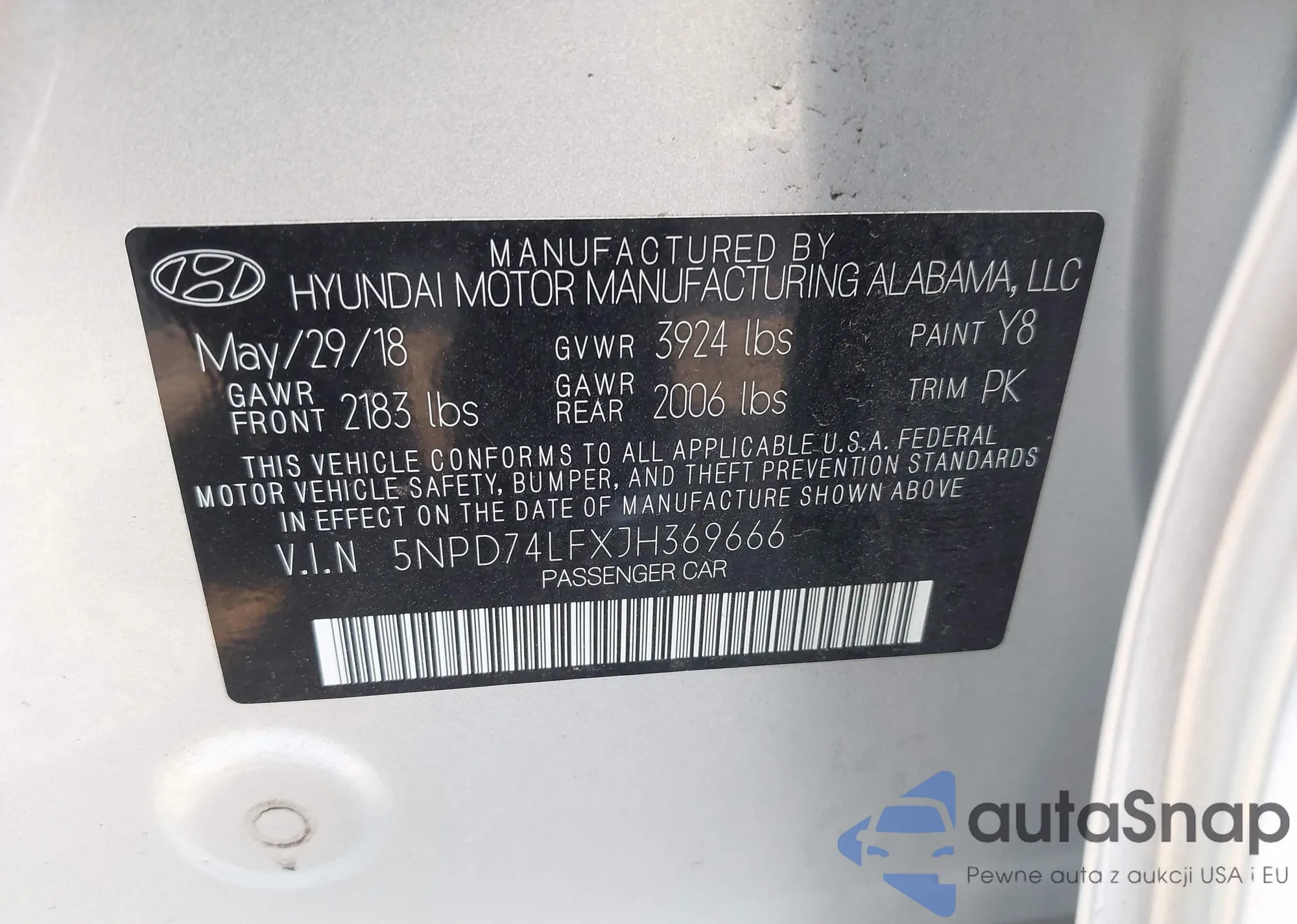 LOT: 42725389 VIN: 5NPD74LFXJH369666
