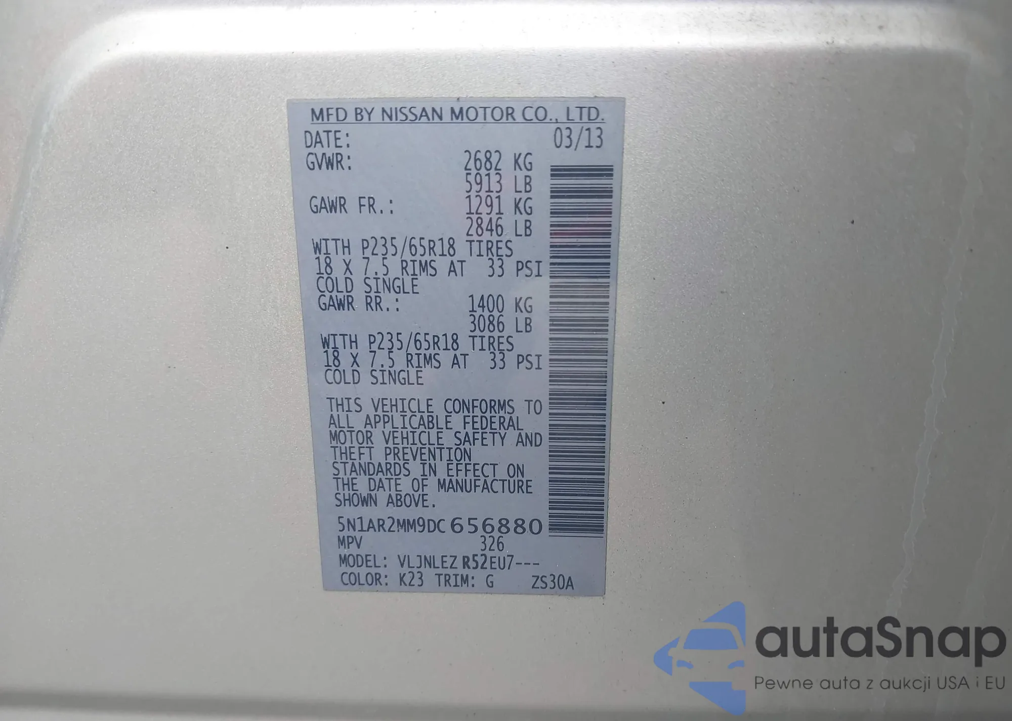 LOT: 42729775 VIN: 5N1AR2MM9DC656880