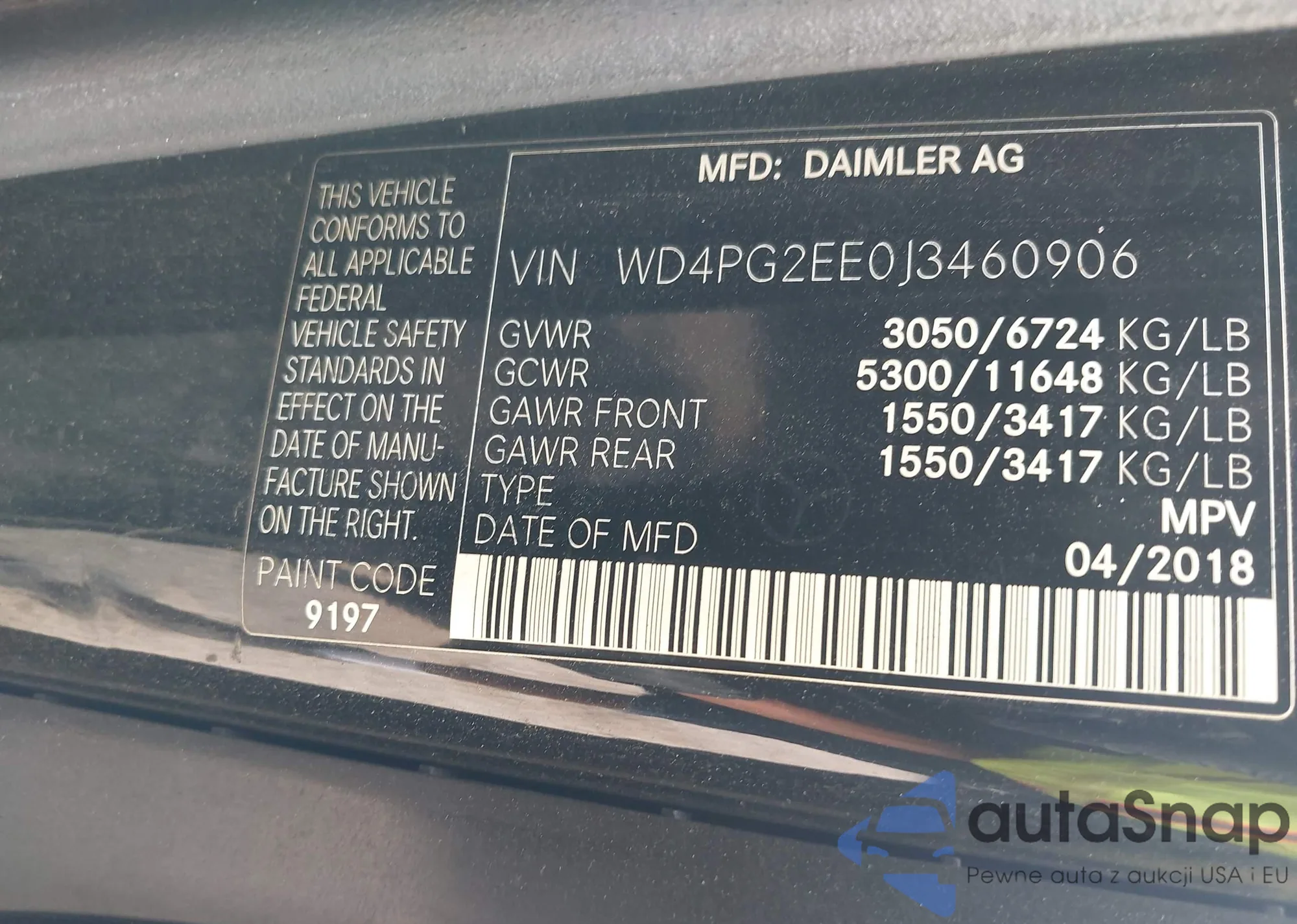 LOT: 42486423 VIN: WD4PG2EE0J3460906