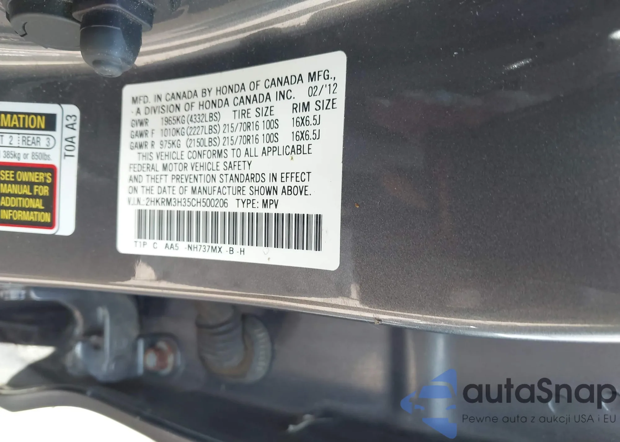 • VIN 2HKRM3H35CH500206