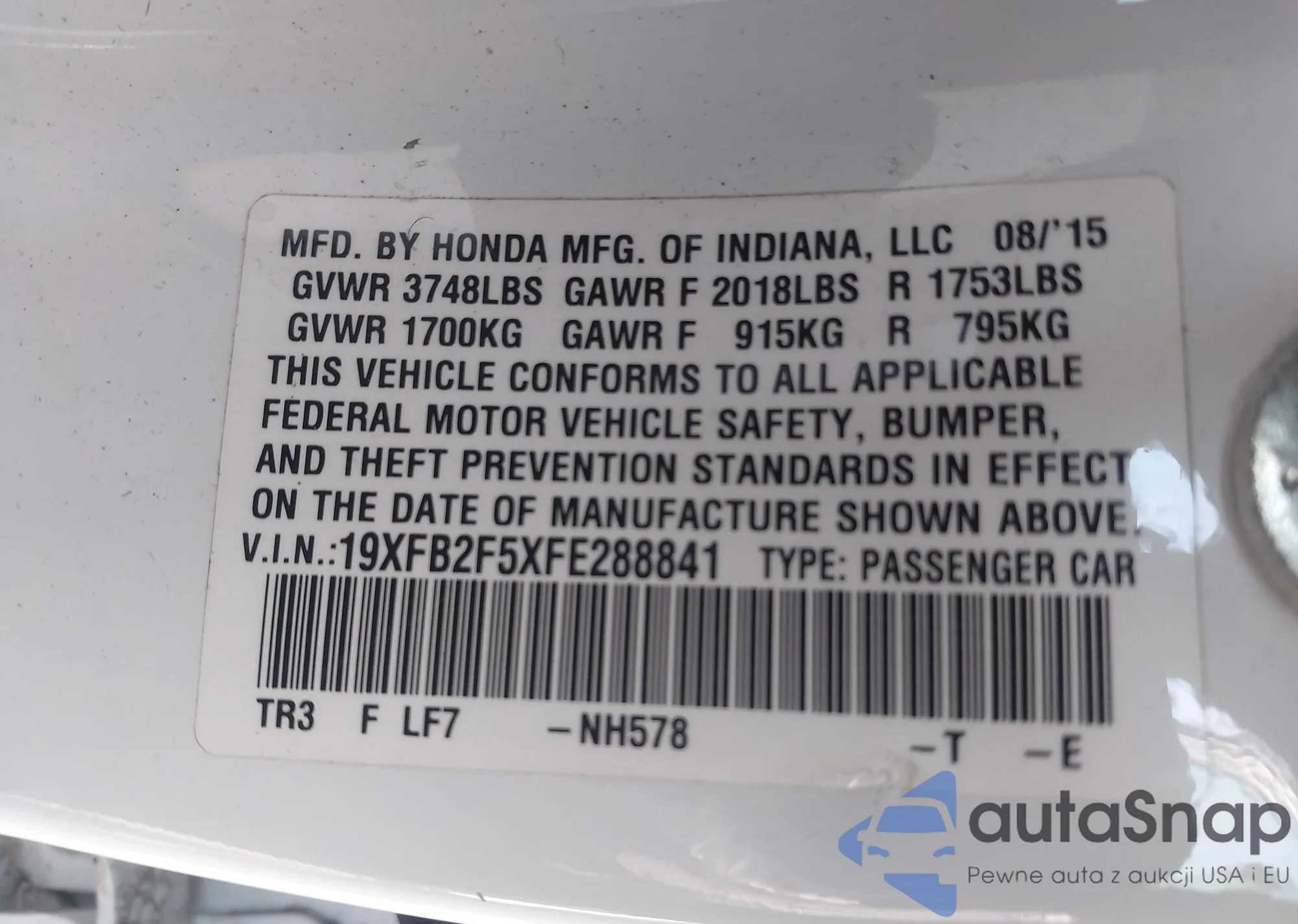 LOT: 41913439 VIN: 19XFB2F5XFE288841