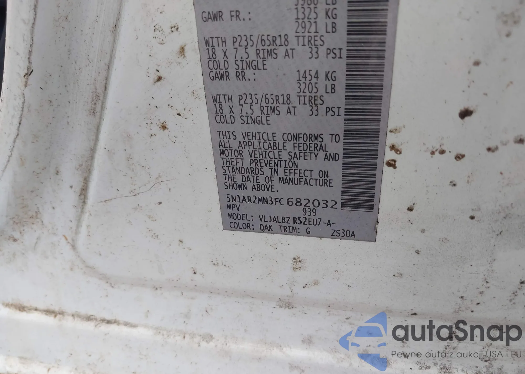 LOT: 42459290 VIN: 5N1AR2MN3FC682032
