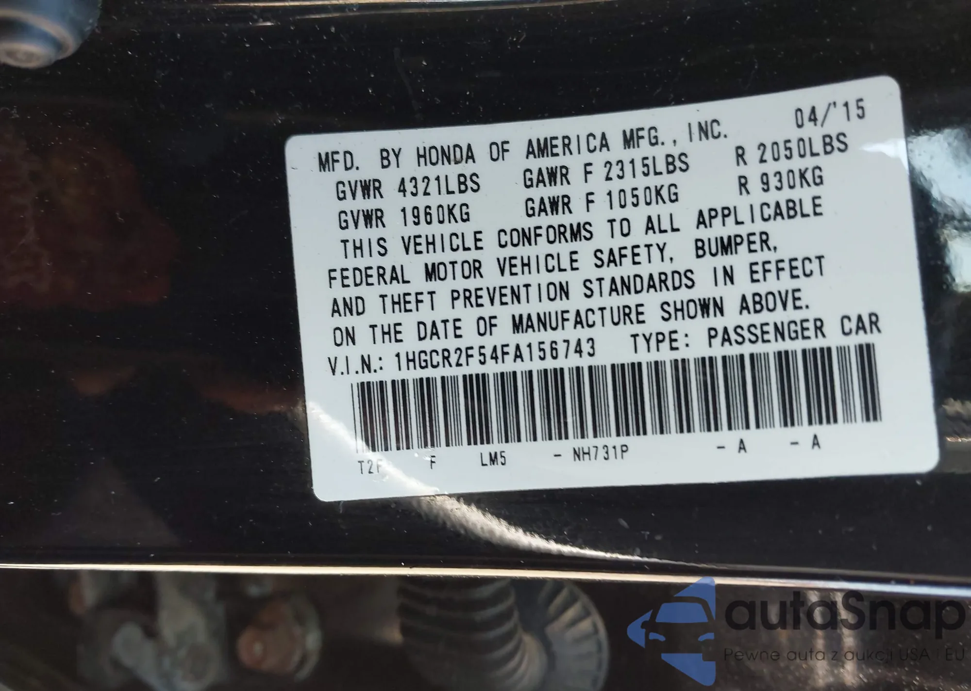 LOT: 42548042 VIN: 1HGCR2F54FA156743