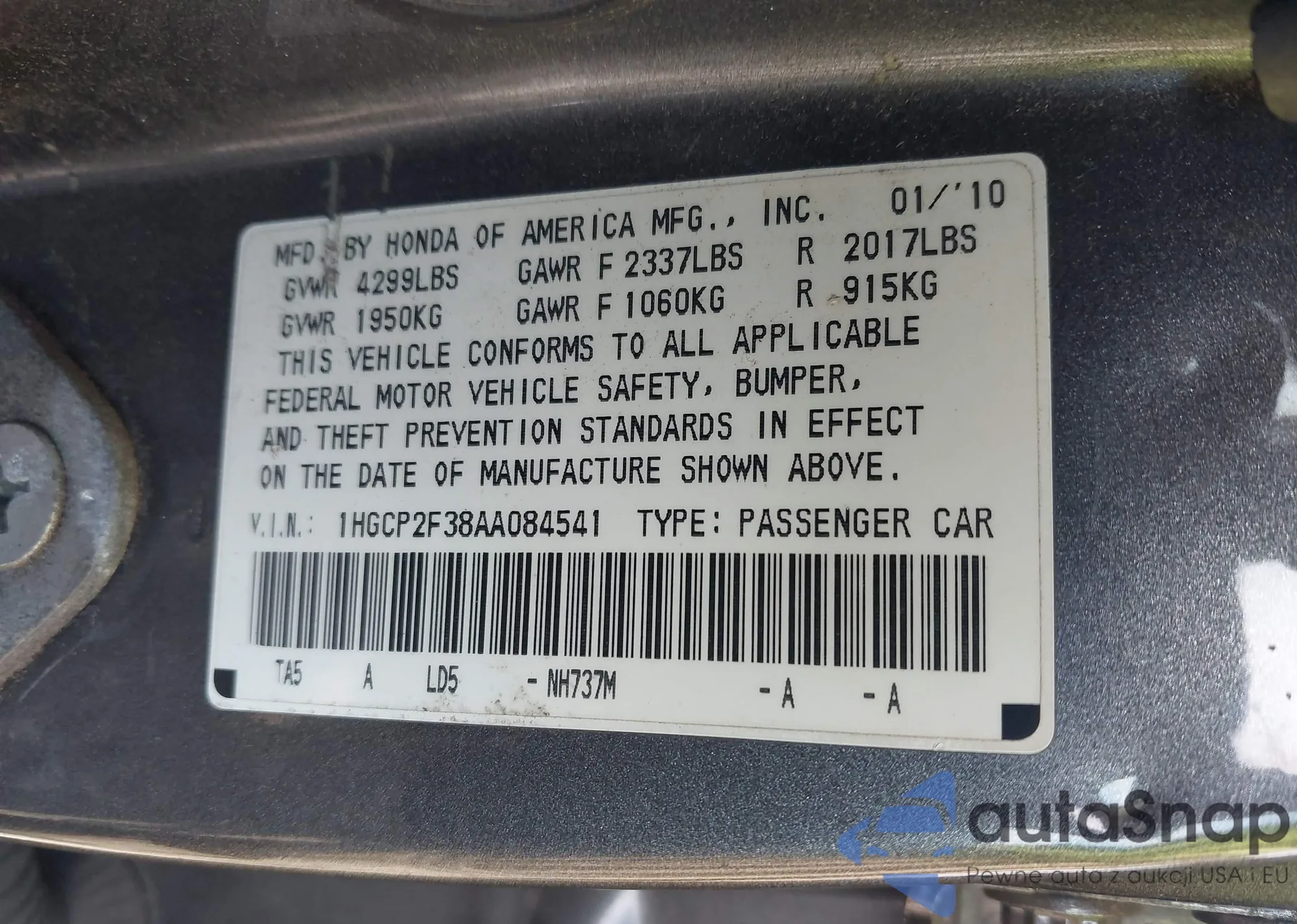 • VIN SHHFK7H59JU213172