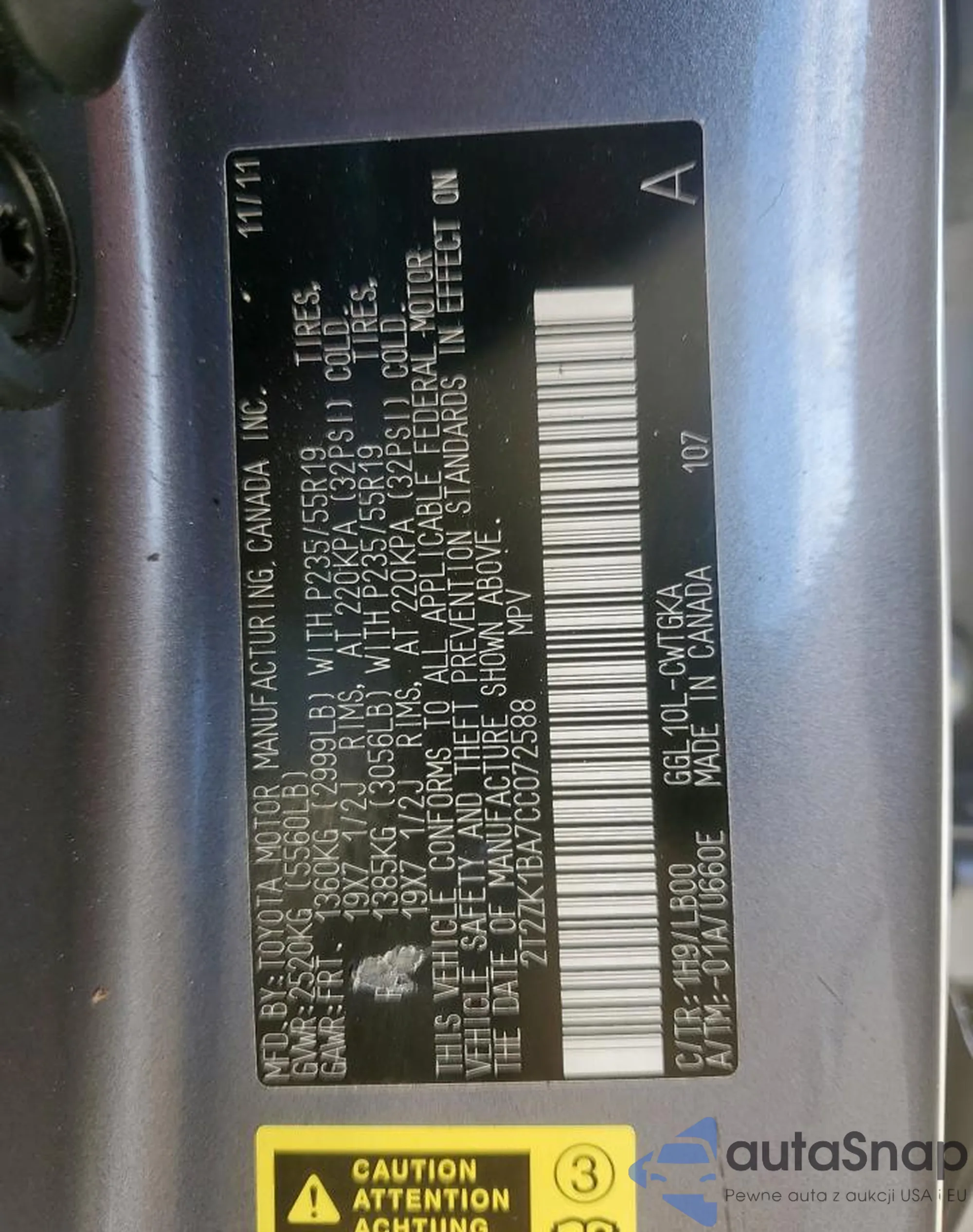 • VIN 2T2ZK1BA7CC072588