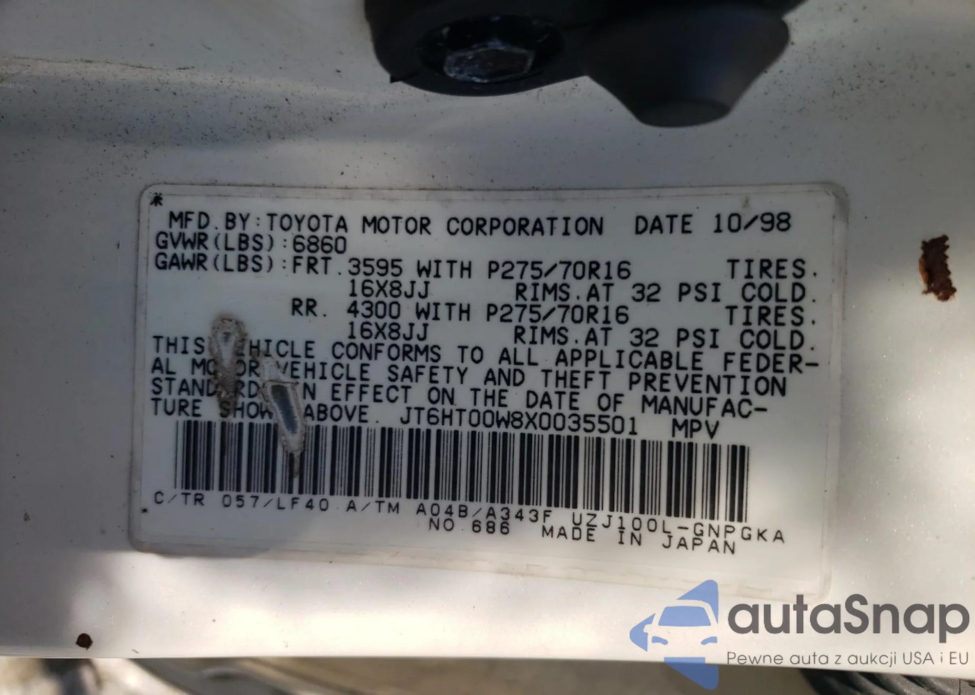 LOT: 64906965 VIN: JT6HT00W8X0035501