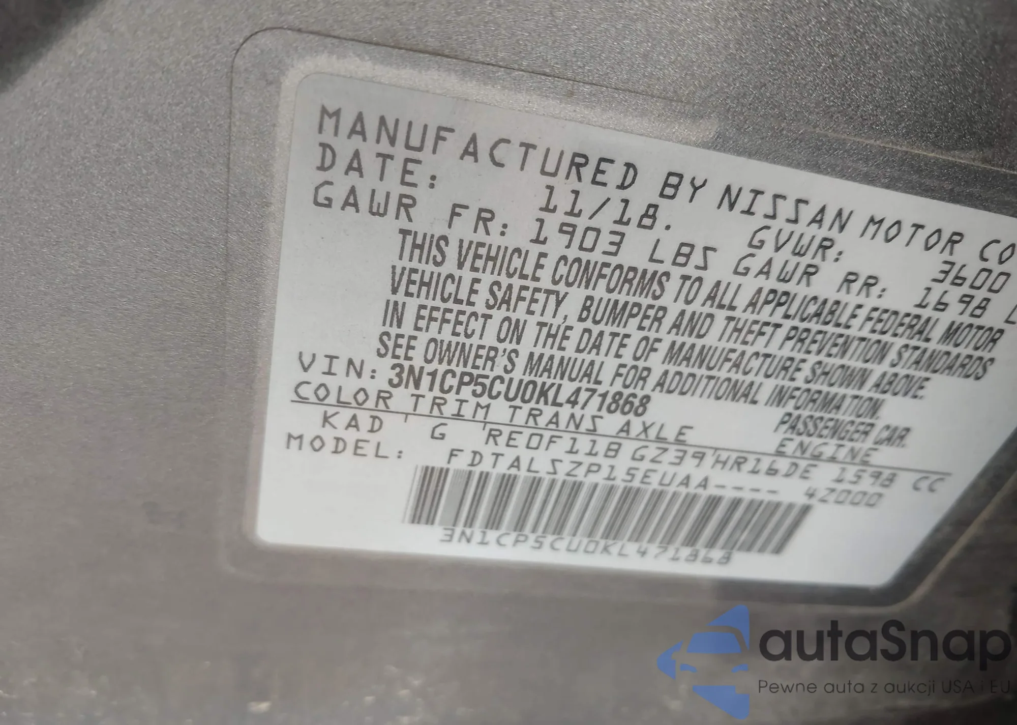 LOT: 41518250 VIN: 3N1CP5CU0KL471868