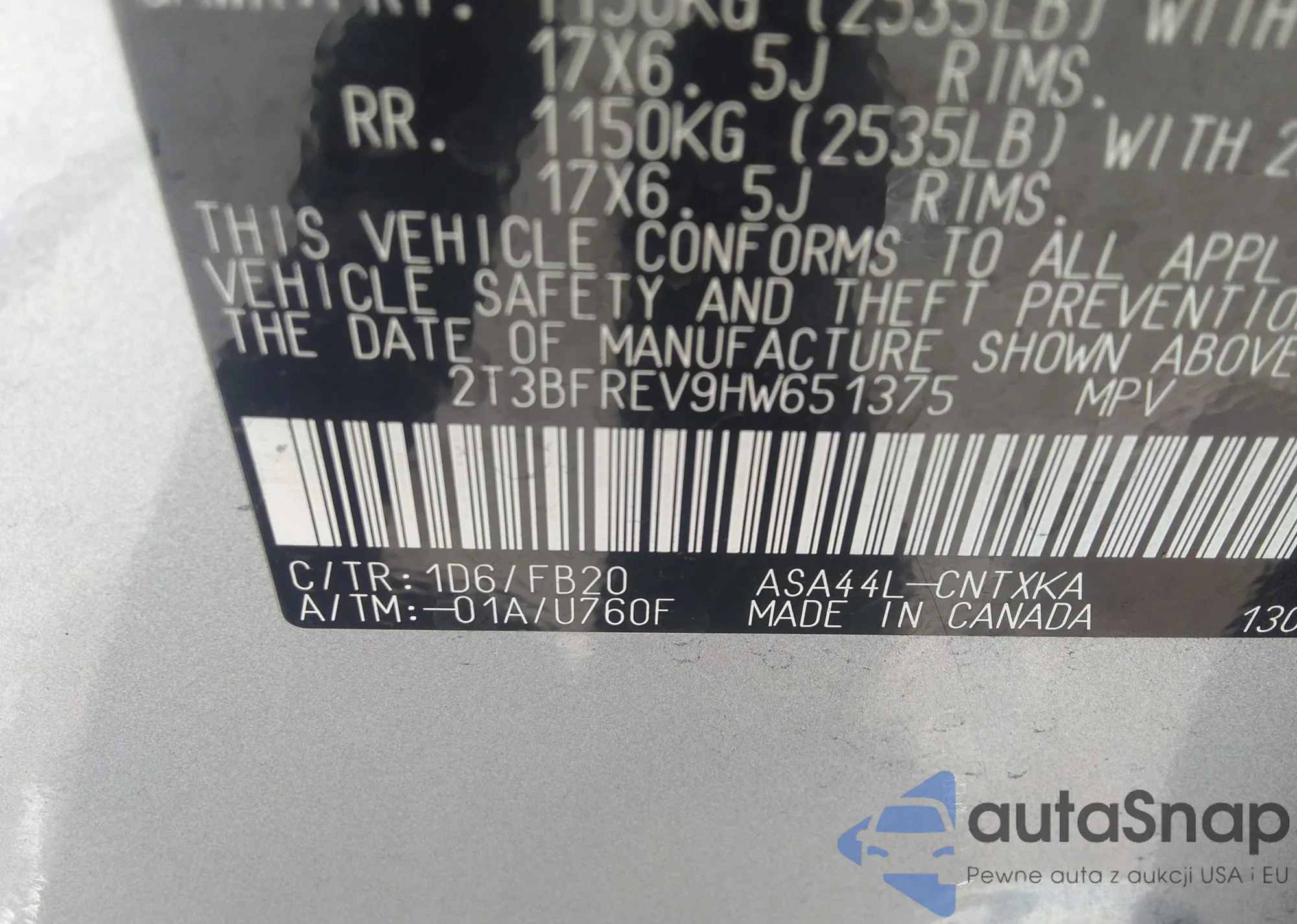 • VIN 2T3BFREV9HW651375