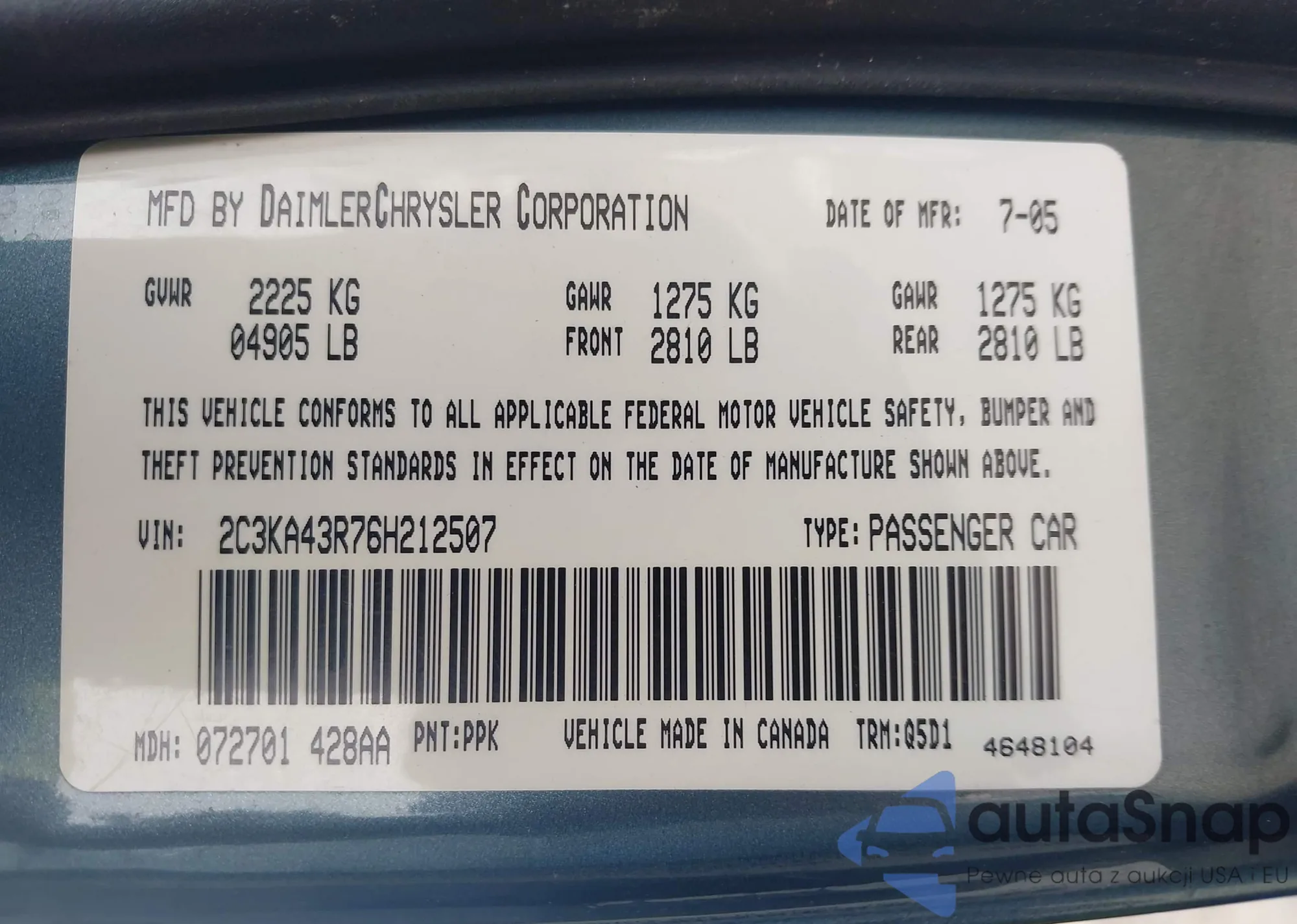 LOT: 42491903 VIN: 2C3KA43R76H212507